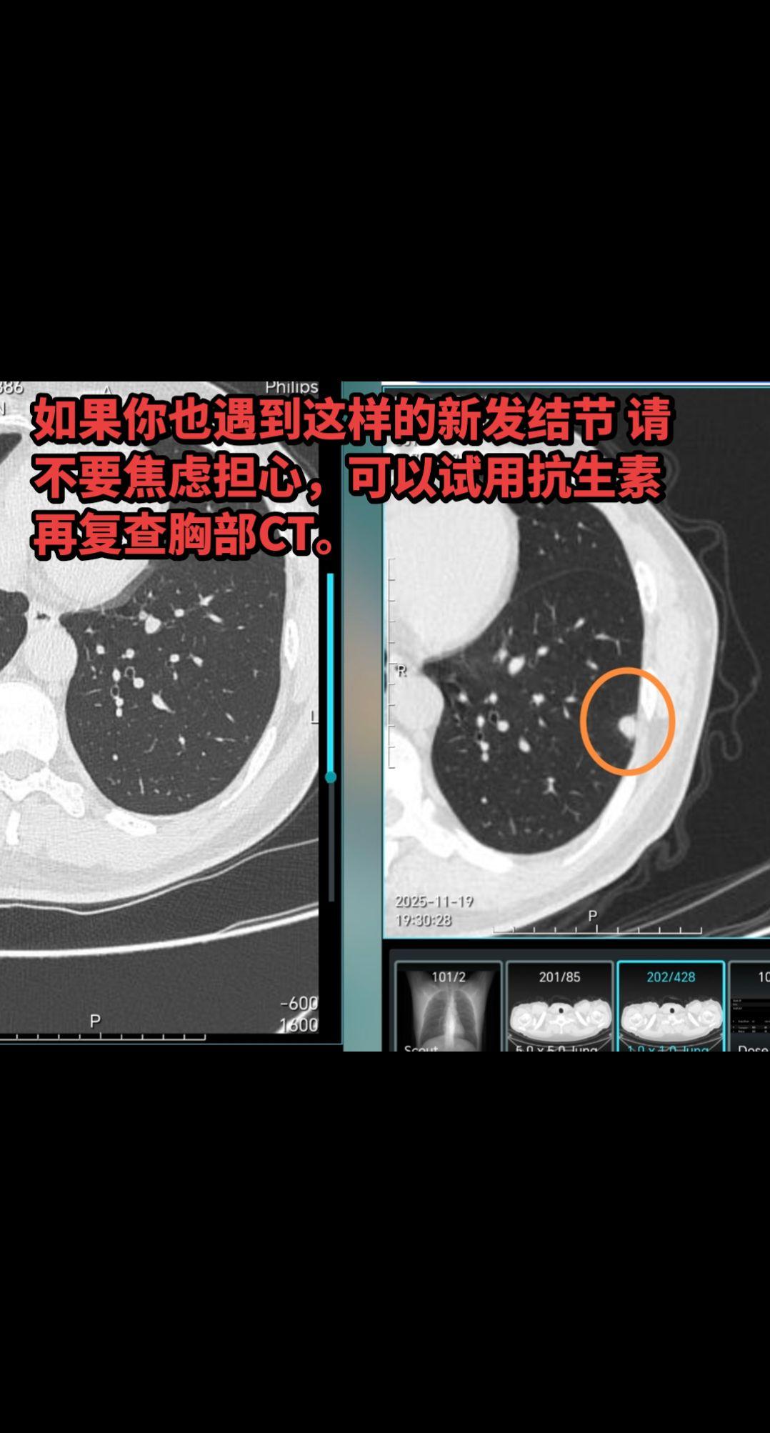 这类结节多考虑炎症,无须担心!该患者 2024.11 曾因其他结节复查胸部 CT,今年例行年度复查发现新增了两个结节,一个是实性结节,另一个是磨玻璃结节。像此类在半年到一年新出现的实性结节或磨玻璃结节一般考虑是炎性结节。因为肿瘤性的结节不会在短期内突然出现,只有炎性结节才会在短期内出现。如果你也遇到这样的新发结节 请不要焦虑担心,可以试用抗生素 再复查胸部CT。