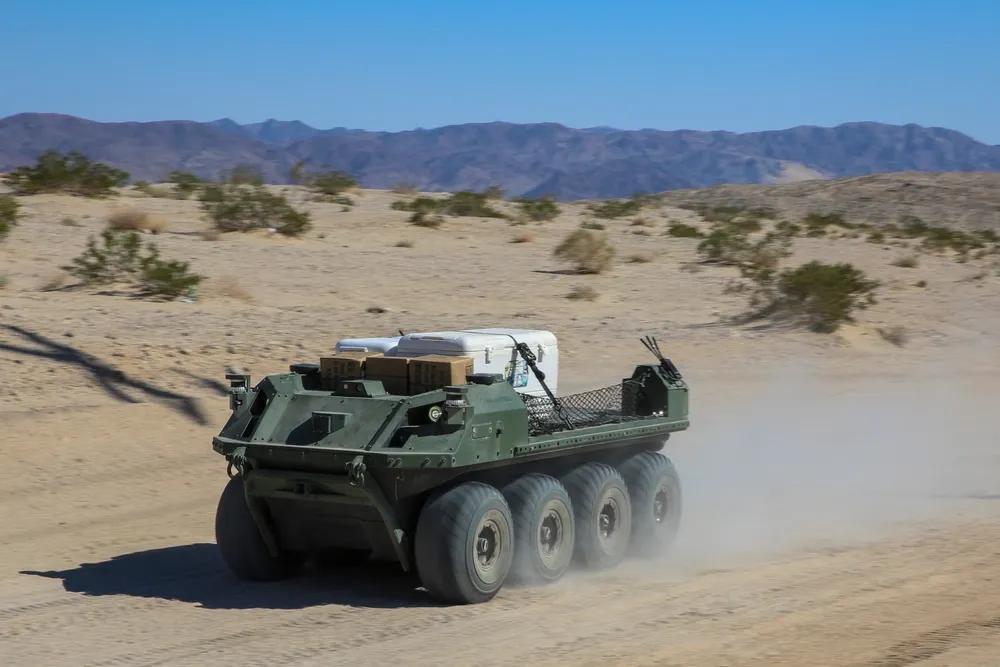 10月19日,一辆Mission Master无人地面车辆在加利福尼亚州二十九棕榈海军陆战队空地作战中心作为无人后勤车队的一部分穿越沙漠。由德国莱茵金属公司研发的Mission Master旨在提高野战后勤的灵活性。
