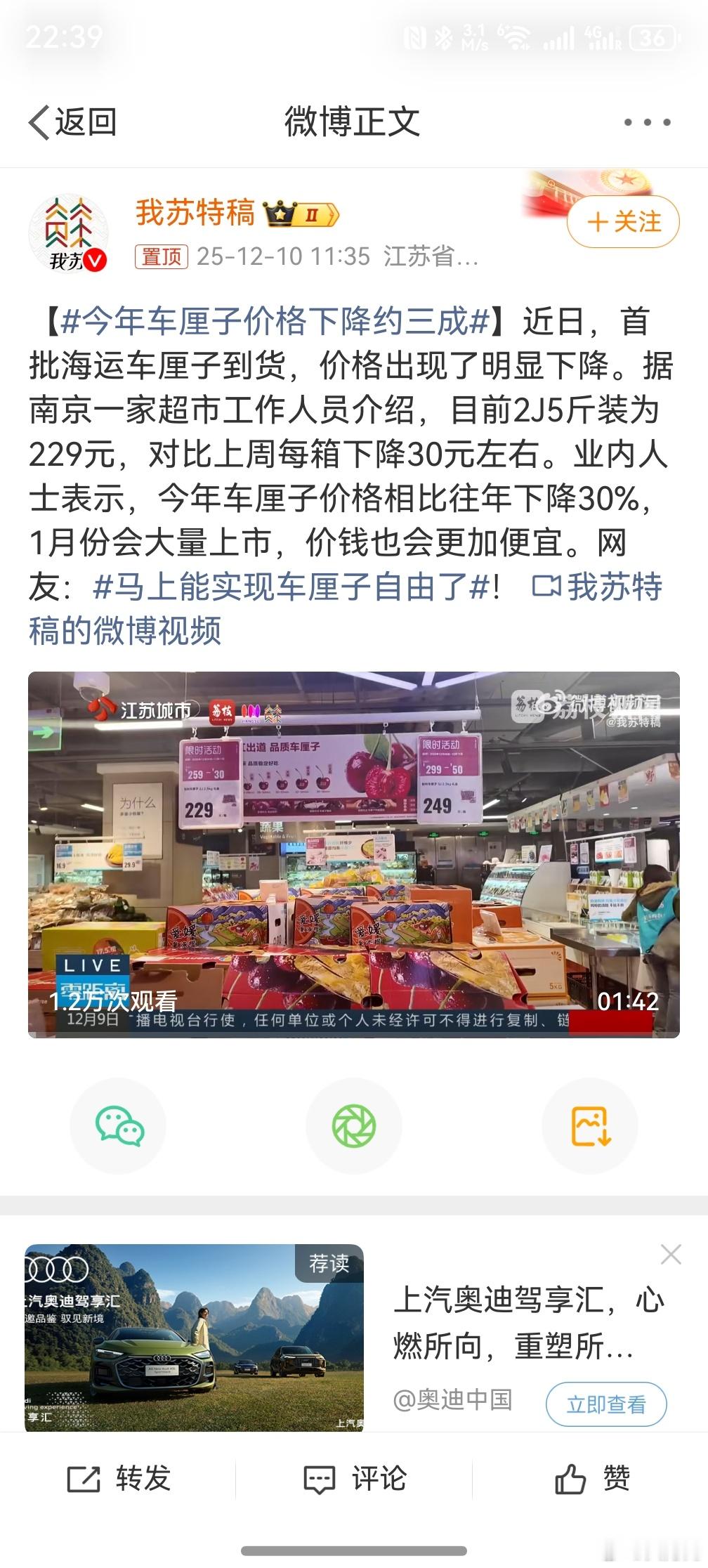 今年车厘子价格下降约三成,只要价格不降到我们小区楼下的水果店,那对我来说就不算
