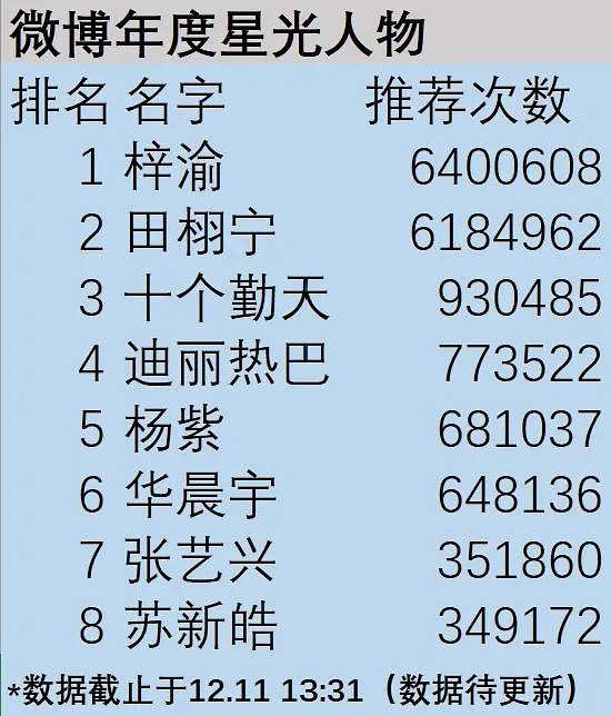 截止今天微博之夜星光人物排名前八:梓渝,田栩宁,十个勤天,迪丽热巴,杨紫,华晨宇,张艺兴,苏新皓🤔顶流格局算不算大洗牌了