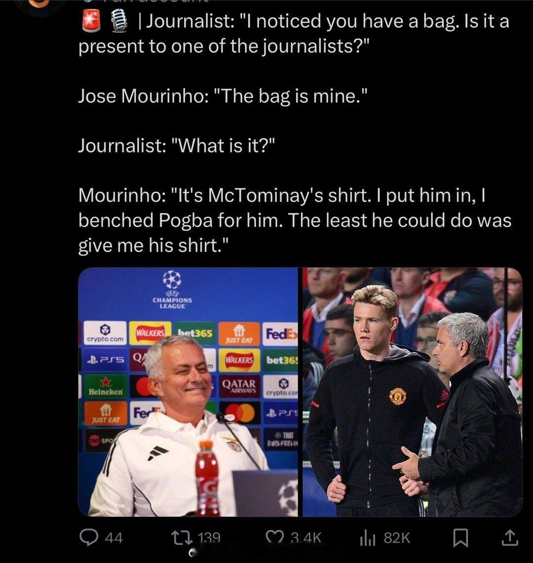 昨晚欧战中穆里尼奥率领的本菲卡2-0麦克托米纳效力的那不勒斯赛后发布会上记者:你旁边的袋子里是给在座的记者们的礼物吗?穆里尼奥:这是我自己的袋子。记者:是什么?穆里尼奥:麦克托米纳的球衣。我给了他在曼联上场的机会,为了他我把博格巴按在了板凳上。他至少可以送我件球衣吧