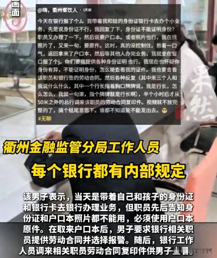 银行取钱遭到内部规定对待,男子选择报警 男子到银行取钱,没能满足银行职员的无理要求,银行以内部规定说事。男子的火一下子就上来了,当场要求银行职员出示银行与职员的劳动合同,证明你是银行的正式工,最后银行职员以合同可以看,但是不能拍照为由,银行的规定是否存在不合理要求?