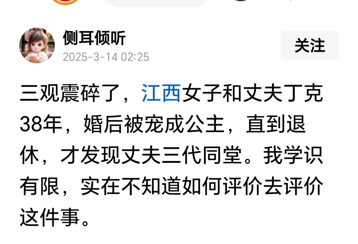 江西女子和丈夫丁克38年,婚后被宠成公主,直到退休才发现丈夫早已三代同堂,女子扬言:必将付出巨大代价就。丁克,那要看是在什么情况下做丁克一族,一,双方有生育能力,但都不愿生,这是标准的丁克一族。二,一方能生育,另一方不能生育,由于会生育的一方爱对方,答应做丁克一族。三,一方不会生育,另一方会生育,但骗对方要做丁克一族,会生育的一方被迫同意。四,双方都没有生育能力。