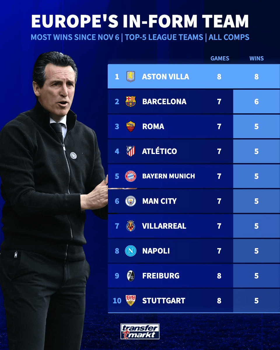 根据Transfermarkt的最新统计,2025年11月6日以来,欧洲五大联赛状态最好的球队排名如下: