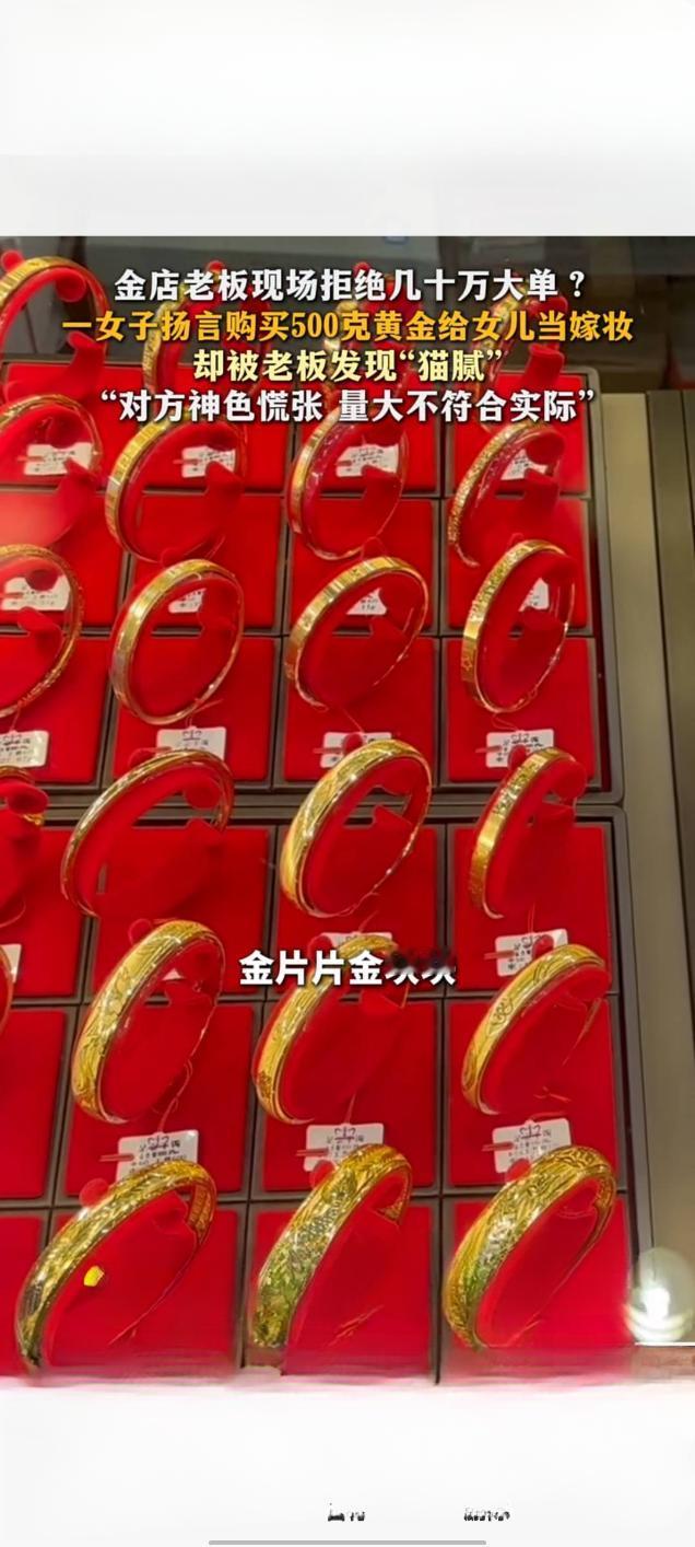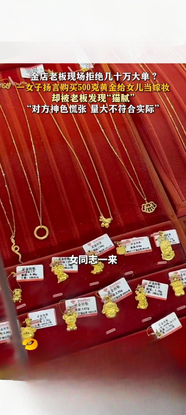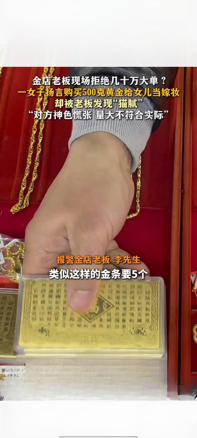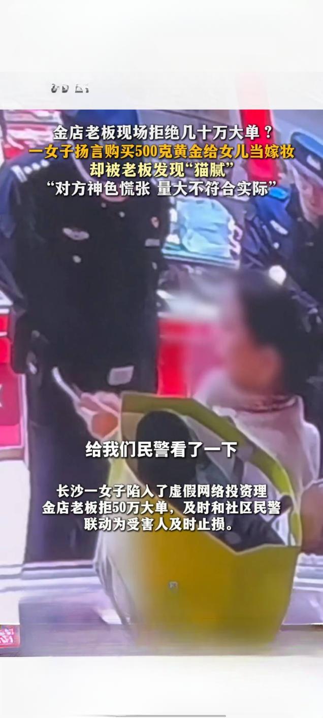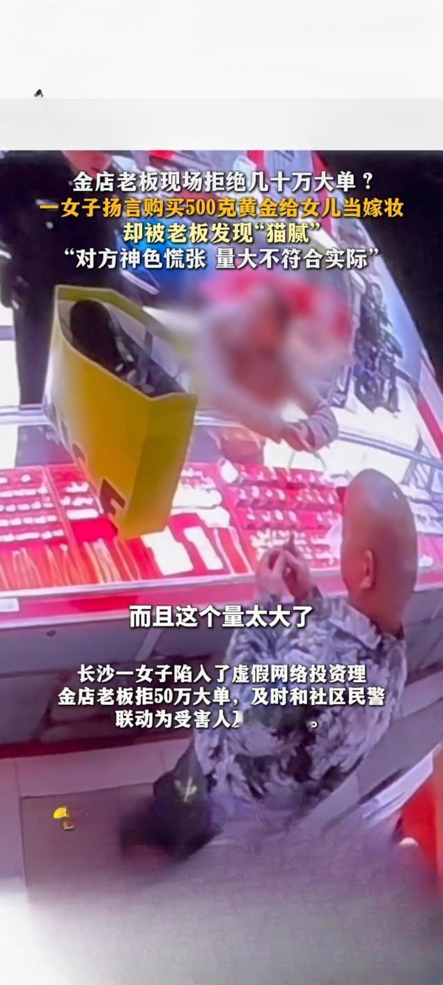 长沙金店老板警惕异常交易,拒收数十万“嫁妆金”订单 2025年12月10日,湖南长沙一家金店发生一起引发关注的交易事件。一名女子声称要为女儿准备嫁妆,欲豪掷数十万元购买500克黄金,但订单最终被警惕性高的金店老板当场拒绝。 据风芒新闻报道,当日下午,该女子进店后直接提出购买500克黄金。面对这笔价值不菲的“大单”,金店店主在与女子沟通细节时,却发现其言谈存在矛盾。女子对黄金纯度、支付方式等关键问题的回答含糊不清,神色慌张,且500克的购买量远超普通家庭嫁妆的常见规格。 店主结合自身行业经验判断,这笔“量大不符合实际需求”的交易可能暗藏风险,疑似涉及非法资金流转等猫腻,最终决定拒绝。事后,店主表示,黄金交易必须合规,商家面对异常订单时应保持警惕,这既是自我保护,也是履行社会责任。 此事经网络传播后,获得了大量网友支持。不少网友称赞店主“有责任心”、“好样的”,认为在大额交易中保持谨慎十分必要。目前,该事件具体情况仍在进一步关注中。谨慎交易诈骗 陪嫁金条 长沙黄金价格 长沙金饰