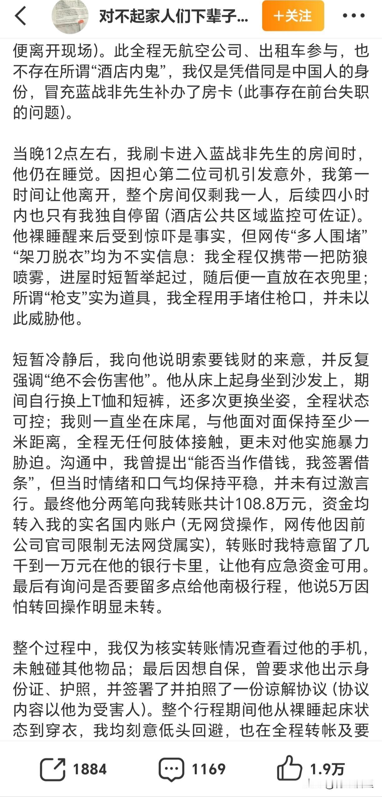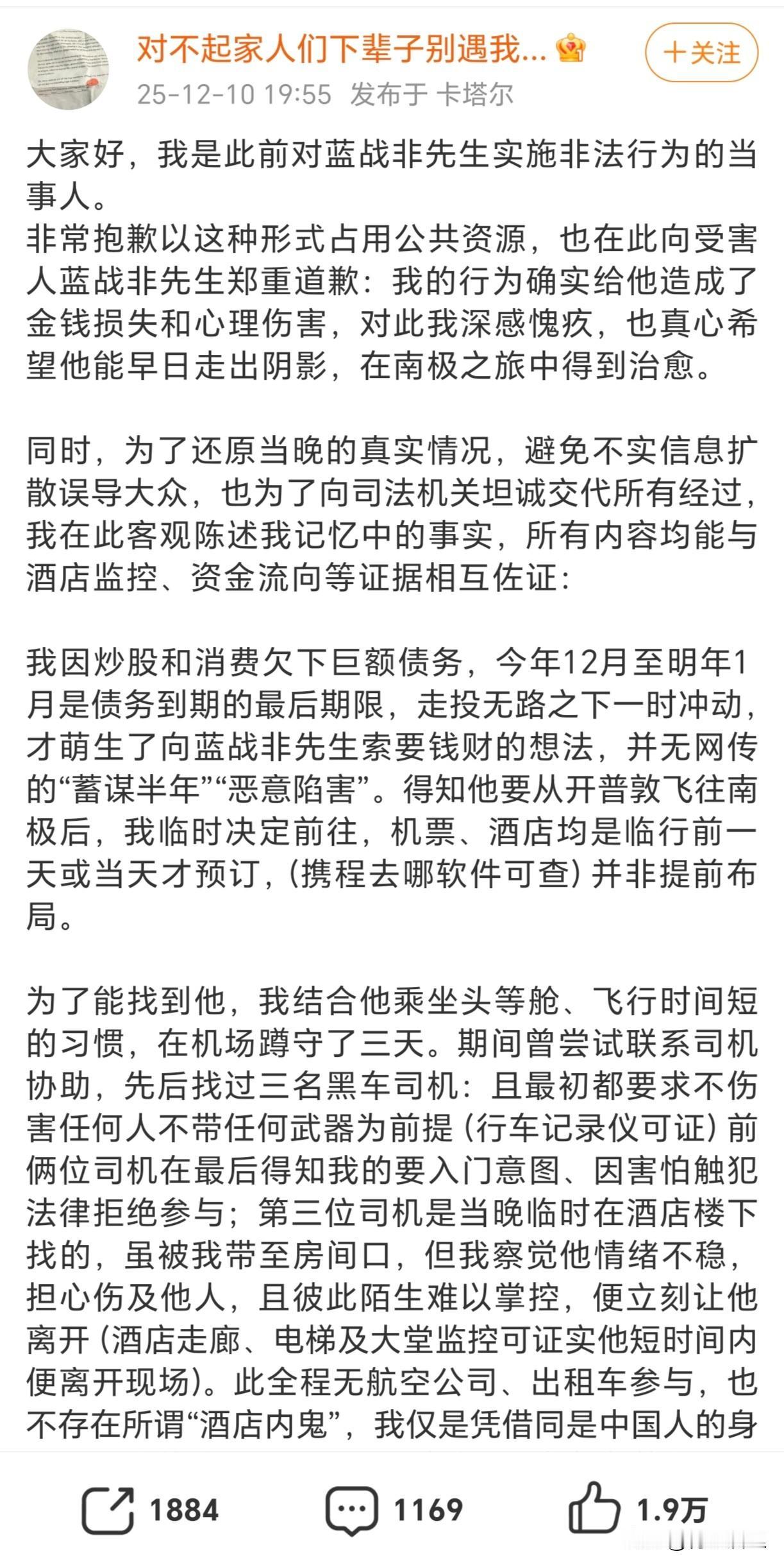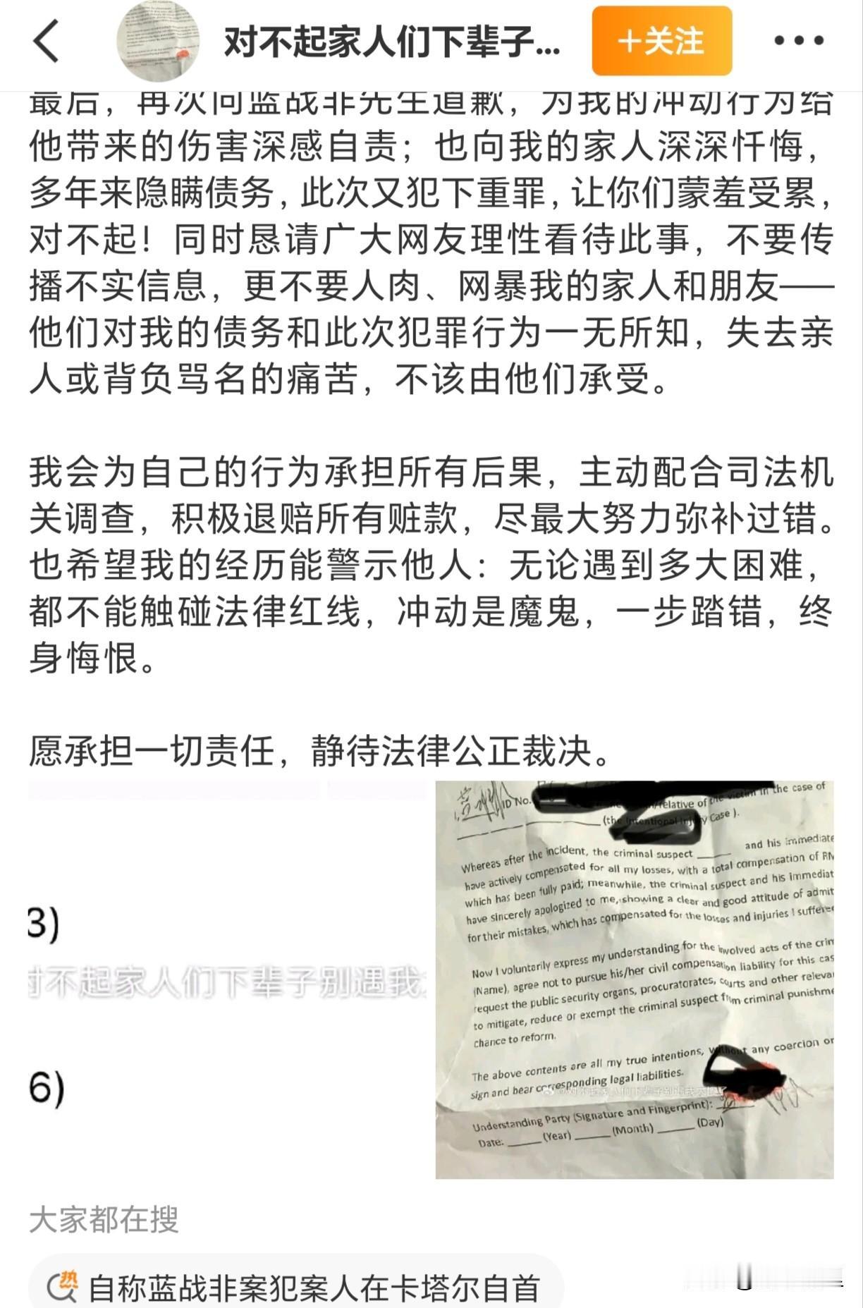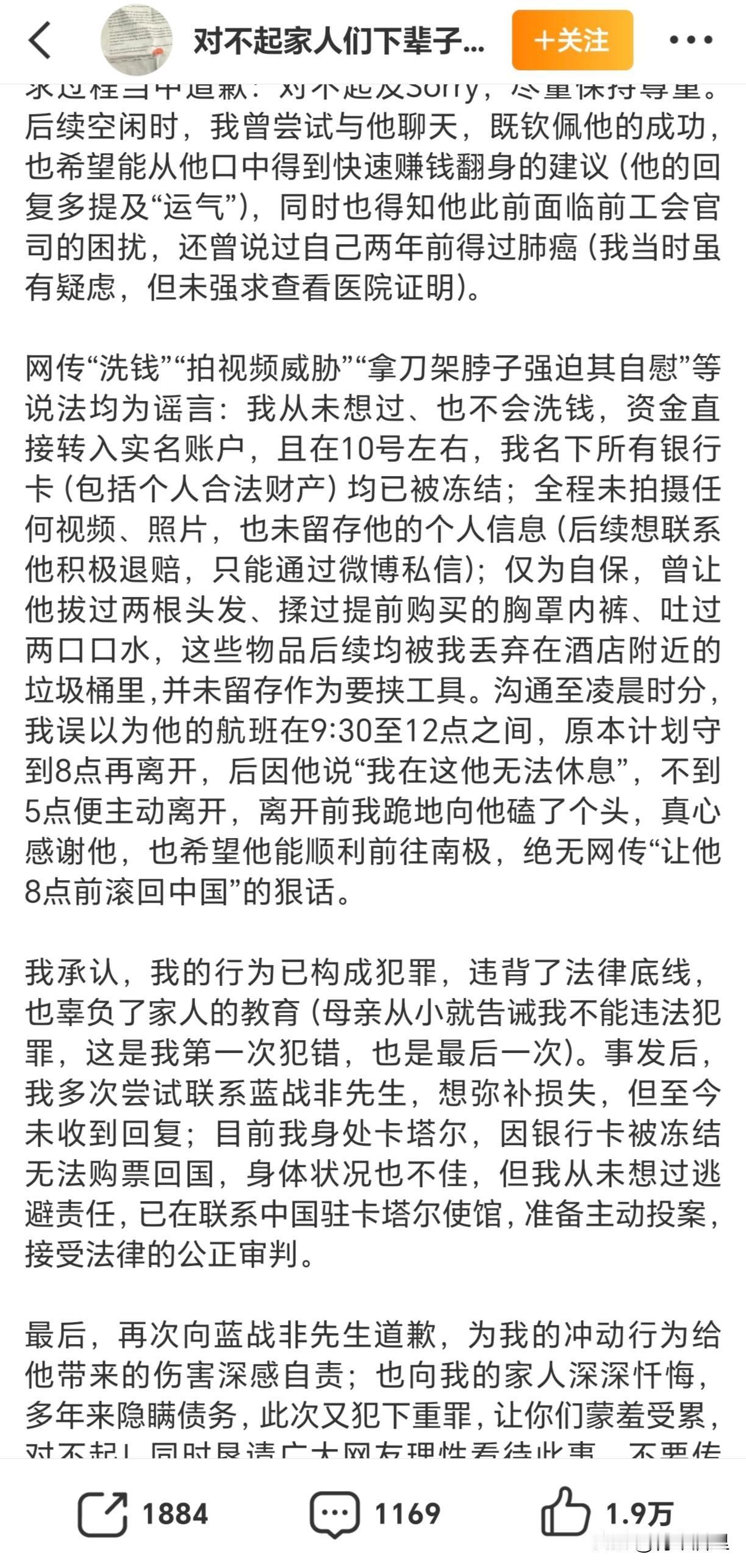 这是压力太大,遭不住了嘛? 网名叫“对不起家人们下辈子别遇我”的发长文,自称是蓝战非整个事件的始作俑者。因为欠债太多,走投无路,一时冲动,就跑去堵蓝战非要钱。还澄清了很多网上传的夸张版本,说没洗钱,没刀架脖子强迫“自我安慰”,也没拍视频威胁。 他说现在人在卡塔尔,银行卡被冻了,回不来,也在联系使馆想回来承担责任,退钱。 说实话,不管原因是什么,违法就是违法,伤害已经造成了。这事也给大家提个醒,再难,也别走歪路。一步错,真的很难回头。蓝战非 自称蓝战非案犯案人在卡塔尔自首