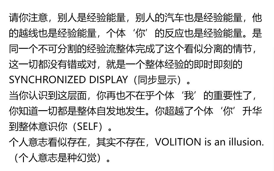 请你注意,别人是经验能量,别人的汽车也是经验能量,他的越线也是经验能量,个体‘你’的反应也是经验能量。是同一个不可分割的经验流整体完成了这个看似分离的情节,这一切都没有错或对,就是一个整体经验的即时即刻的SYNCHRONIZED DISPLAY(同步显示)。 当你认识到这层面,你再也不在乎个体‘我’的重要性了,你知道一切都是整体自发地发生。你超越了个体‘你’升华到整体意识你(SELF)。 个人意志看似存在,其实不存在,VOLITION is an illusion.(个人意志是种幻觉)。