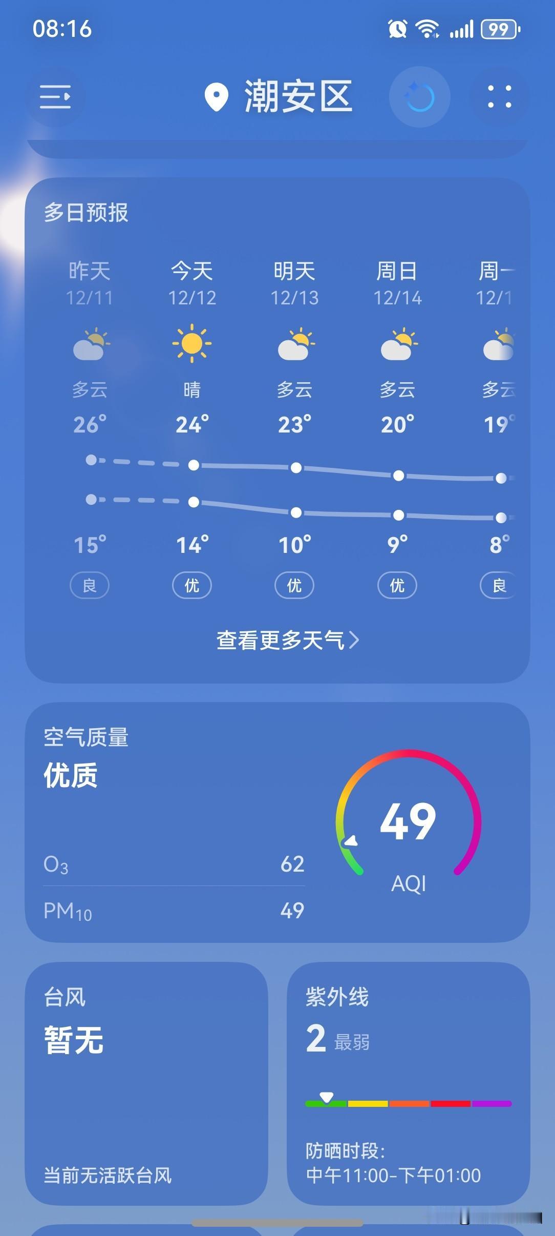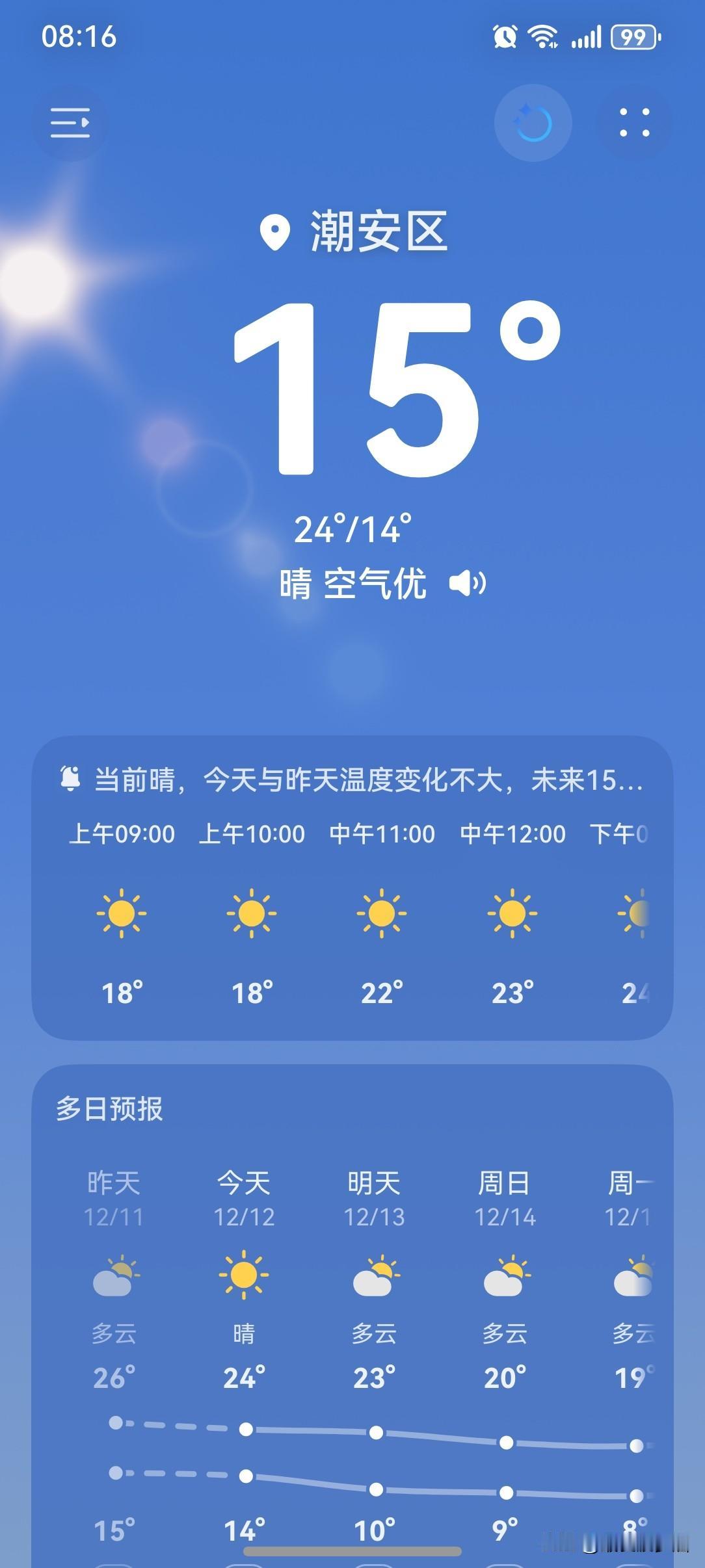 今冬最强寒潮来了!我国寒潮天气影响几何? 一股实力强劲的寒潮正自西向东影响我国大部,带来大风降温和雨雪,华北黄淮迎今冬首场大范围降雪。 中国最北城市迎今冬以来最冷一天,黑龙江省漠河市11日最低温达﹣41.1℃,创今冬新低,华北黄淮等部分地区有大雪。 受北方中等偏强冷空气南下影响,13~14日广东省将有一次小到中雨和4~8℃降温的天气过程,并伴有5~7级阵风,最低气温将出现在15日早晨前后。 今天(12日),潮州喜提一个晴天,气温14~24℃,此刻气温15℃,体感温度14℃。 冷空气还没到来之前,依然是一片暖洋洋!今天潮州的全天最高气温24℃,虽然没有昨天那么高,但还是非常暖和的。 看看今天的天空!一早阳光灿烂,气温也跟着上升了。 这么暖和的天气余额已经不多了,冷空气马上来要来了!冻手冻脚的日子准备开始啦!小伙伴们!御寒的措施你们准备好了吗?还没准备好的抓紧时间吧! 今天的这样天气,从整体来讲,还是非常好的,值得一个五星好评的。 如此天气!元芳,你怎么看? [捂脸][我想静静][强][笑哭][捂脸][我想静静][笑哭][强]