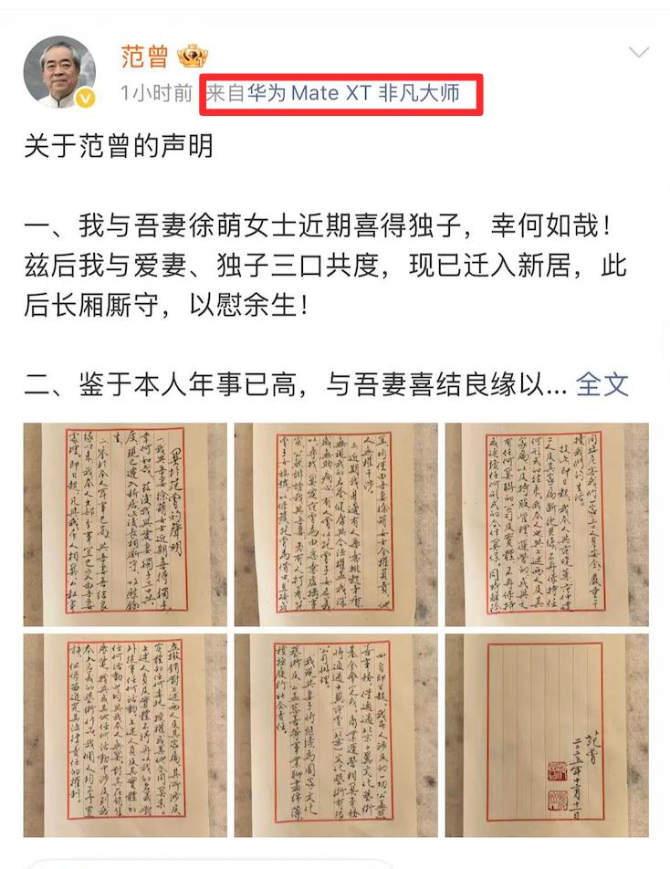 大师不愧是大师,连所用的手机都是“大师”级别! 近日,书法家、中国画大师范增发布了令人震惊的《个人声明》,宣布与女儿、继子断绝关系。从所显示的信息可知,范大师用的是华为Mate XT非凡大师手机。 书法家范增 华为非凡大师2