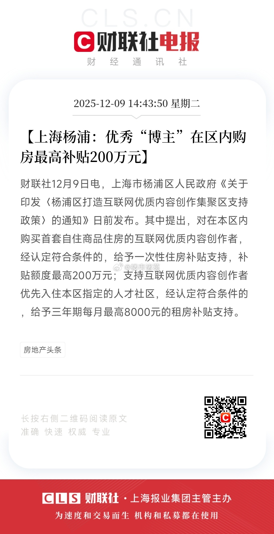 上海杨浦给优秀博主最高购房补贴200万,这力度怎么样?楼市第一线