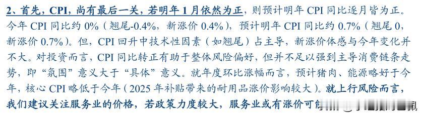 从研报中学金融知识(1)-“翘尾因素” 考虑开辟一块新的内容,从专业报告或材料中,将一些金融或经济常识和术语科普给大家。(背景是部分读者在我呼吁大家看一些高质量内容时表示看不懂,没事我们可以慢慢积累) 这篇原文提到:“今年CPI同比约0%(翘尾-0.4%,新涨价0.4%),预计明年CPI同比约0.7%(翘尾0,新涨价0.7%)。” 这句话的意思是:今年CPI同比为0%,是因为:翘尾因素为-0.4%:即去年价格上涨带来的“拖累”效应(比如去年某商品涨价了,但今年价格没涨,所以同比看起来是下降);新涨价因素为+0.4%:即今年新增的价格上涨贡献了0.4%。两者相抵,总CPI同比为0%。预计明年CPI同比为0.7%,是因为:翘尾因素为0:说明今年的价格变动不会对明年的同比造成额外影响(可能是今年物价稳定或已消化完前期涨幅);新涨价因素为+0.7%:即明年新的价格上涨将带来0.7%的CPI增长。 翘尾因素帮助我们判断当前CPI的上涨是由于当期实际需求上升(新涨价),还是因为过去涨价的滞后影响(翘尾)。这对政策制定和投资决策都很关键。如果翘尾因素逐渐减弱(如文中“翘尾0”),则意味着CPI的变化更多取决于当期经济状况,而非历史因素,这有助于更准确地预判通胀走势。 “翘尾因素”是指上一年度价格上涨对本年度年初CPI同比数据产生的延续性影响。简单来说,就是去年价格上涨的“余波”会持续影响今年年初的同比数据,即使今年物价没有上涨,由于去年同期基数较低或上涨较多,导致今年同比数据仍可能表现为正增长或负增长。它是CPI分析中的一个重要组成部分,用于拆解同比变化的来源。文中通过“翘尾-0.4%”和“翘尾0”说明今年和明年CPI的构成差异,强调明年CPI的增长主要来自新涨价,而非历史因素。