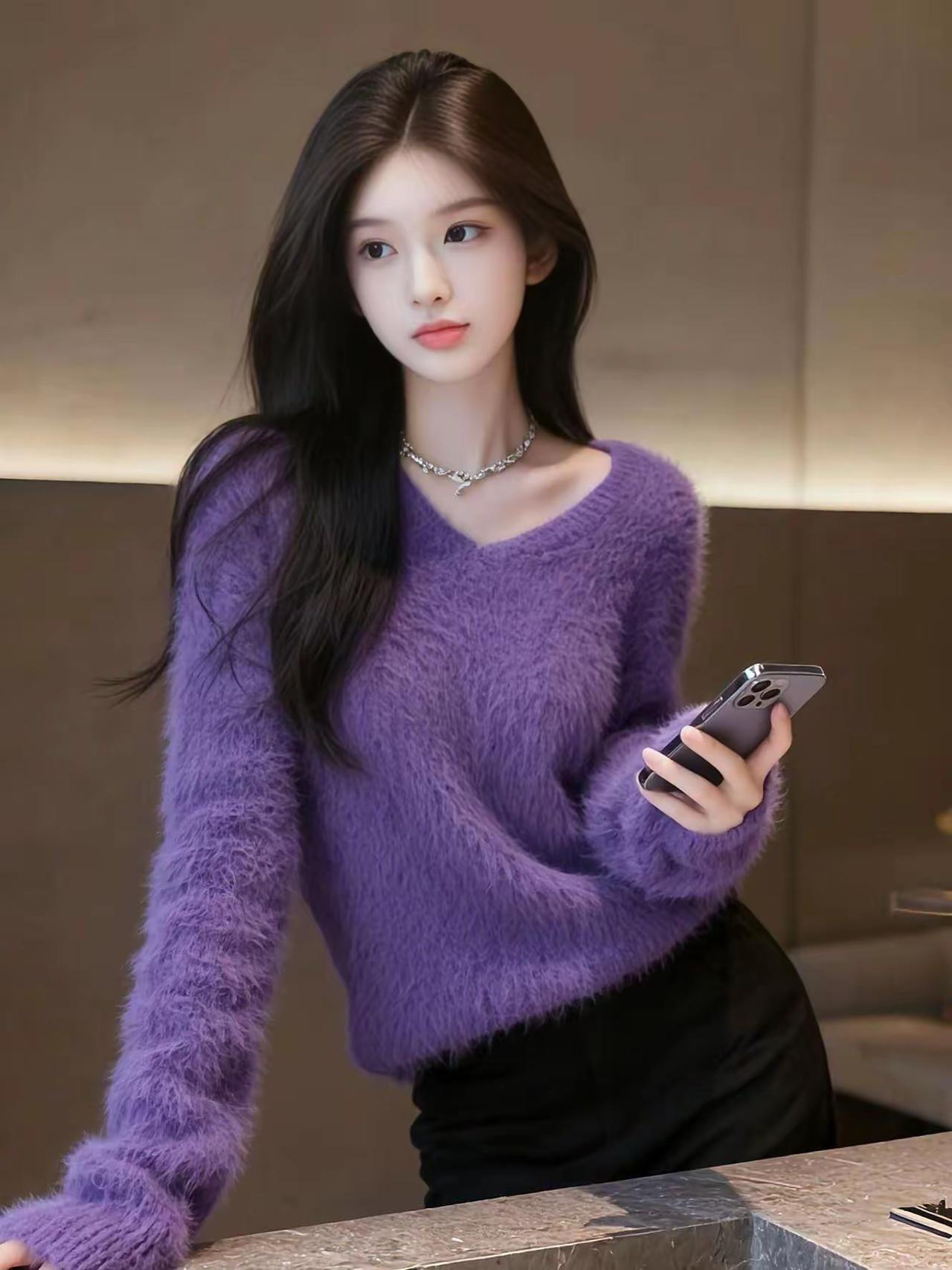 紫色毛衣搭配黑色裙子,气质优雅,手机在手,时尚随行。