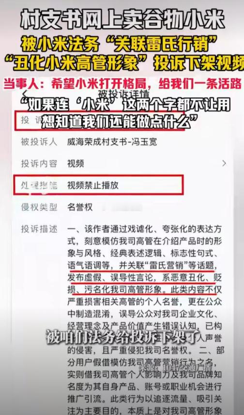 村支书卖小米被投诉下架 近日,山东威海荣成市西初家村村支书冯玉宽,通过直播平台推广当地特产“金谷小米”,视频却被投诉下架,引发广泛讨论。有观点认为,这本质上并非法律争端,而是一次难得的城乡对话与合作契机。平台不应简单下架视频,而可发挥桥梁作用,主动促成双方沟通。这既是平台履行社会责任的体现,也与当前助农惠农的大方向一致。山东威海的金谷小米作为特色农产品,通过直播拓展销路,正是“互联网+农业”的生动实践,对带动当地产业发展和农民增收具有积极意义。事实上,矛盾完全可以转化为共赢。若能通过友好协商,将威海特色小米引入小米公司员工食堂,不仅能为员工餐桌增添一道地道的“小米炖辽参”等健康美食,更是一次极具温度的品牌联动与助农行动。这既能满足企业维护品牌形象的需求,又能实质性地帮助农产品打开销路、提升知名度,堪称“化干戈为玉帛”的最佳范例。当技术创新回归人文关怀,流量热度转化为实际效益,企业格局与乡村发展便能找到共鸣点。这不仅解决了一次具体纠纷,更可为今后类似情况提供一种“沟通先行、寻求共赢”的解决思路。村支书请求给山村小米一条活路