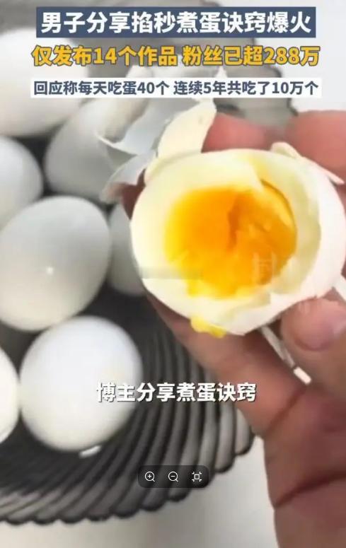 凭煮蛋涨粉356万博主回应爆红 8天涨粉356万,极致日常成就非凡流量近日,抖音一位自称“蛋神”的用户因分享精准的煮蛋技巧迅速走红。仅用8天,其粉丝数从两百飙升至356万,相关视频获赞超千万。“蛋神”本名冯先生,因五年间为健身与健康坚持每日吃蛋、钻研煮法,积累了丰富经验。其走红始于一次偶然评论:他回复网友“水开下蛋,9分12秒捞出过凉水”,试过者纷纷成功,将他推为“煮蛋权威”。网友按其方法成功煮出蛋白Q弹、蛋黄鲜亮的鸡蛋,直呼“拯救了早餐”。也有人求教“奶奶同款蒸蛋”,他耐心给出“冷水入锅、中大火15分钟”的配方,以细节承载温情。面对“一天吃40个蛋”的质疑,他淡然回应,更愿分享选蛋、辨新鲜度等经验,帮助大家找到喜欢的口感。“蛋神”的爆火并非偶然。在生活节奏加快、日常趋于敷衍的当下,他将一件最普通的小事琢磨到极致,恰恰戳中了大众对“认真生活”的渴望与共鸣。这提醒我们:用心对待每一餐、每一个细节,平凡之中亦能开出花来,收获意外馈赠。男子凭煮蛋爆红直呼没想过
