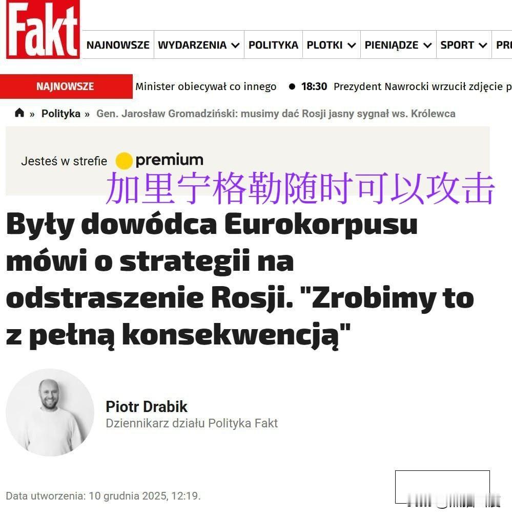 剑指俄罗斯在欧洲的飞地加里宁格勒?北约欧洲这群将军的水平,就是喜欢用嘴吓人。 北约欧洲军团前司令,波兰将军格罗马津斯基宣布,波兰和几个盟国已准备好对俄罗斯加里宁格勒地区发动打击。 北约“将以绝对决心摧毁300公里外的目标,并烧毁最远900公里外的一切”。 看来他读的军事学院没有教过他: 1、俄罗斯有反导防御系统 2、如果华沙在内的欧洲多个城市被导弹袭击,他们拦得住吗? 3、他们有蘑菇云吗?因为俄罗斯有非常多。