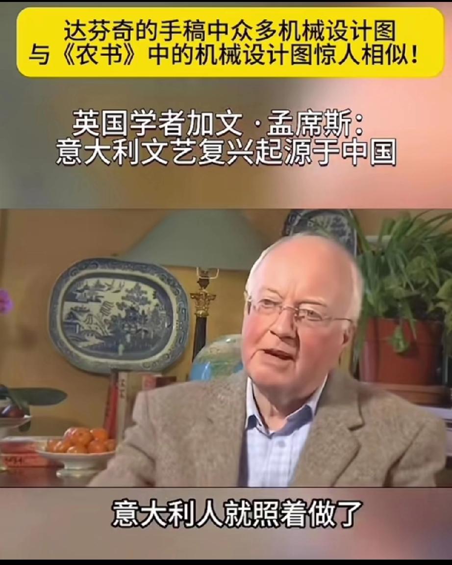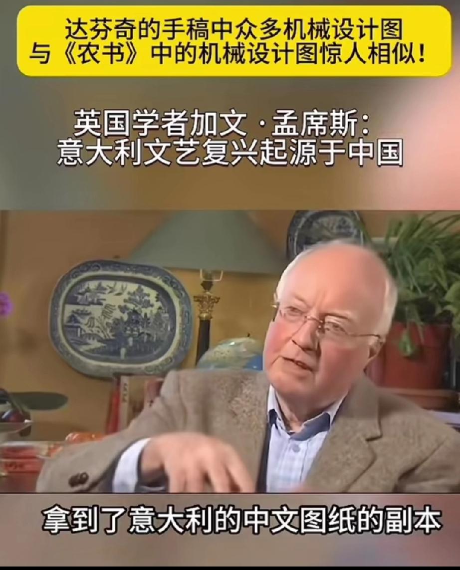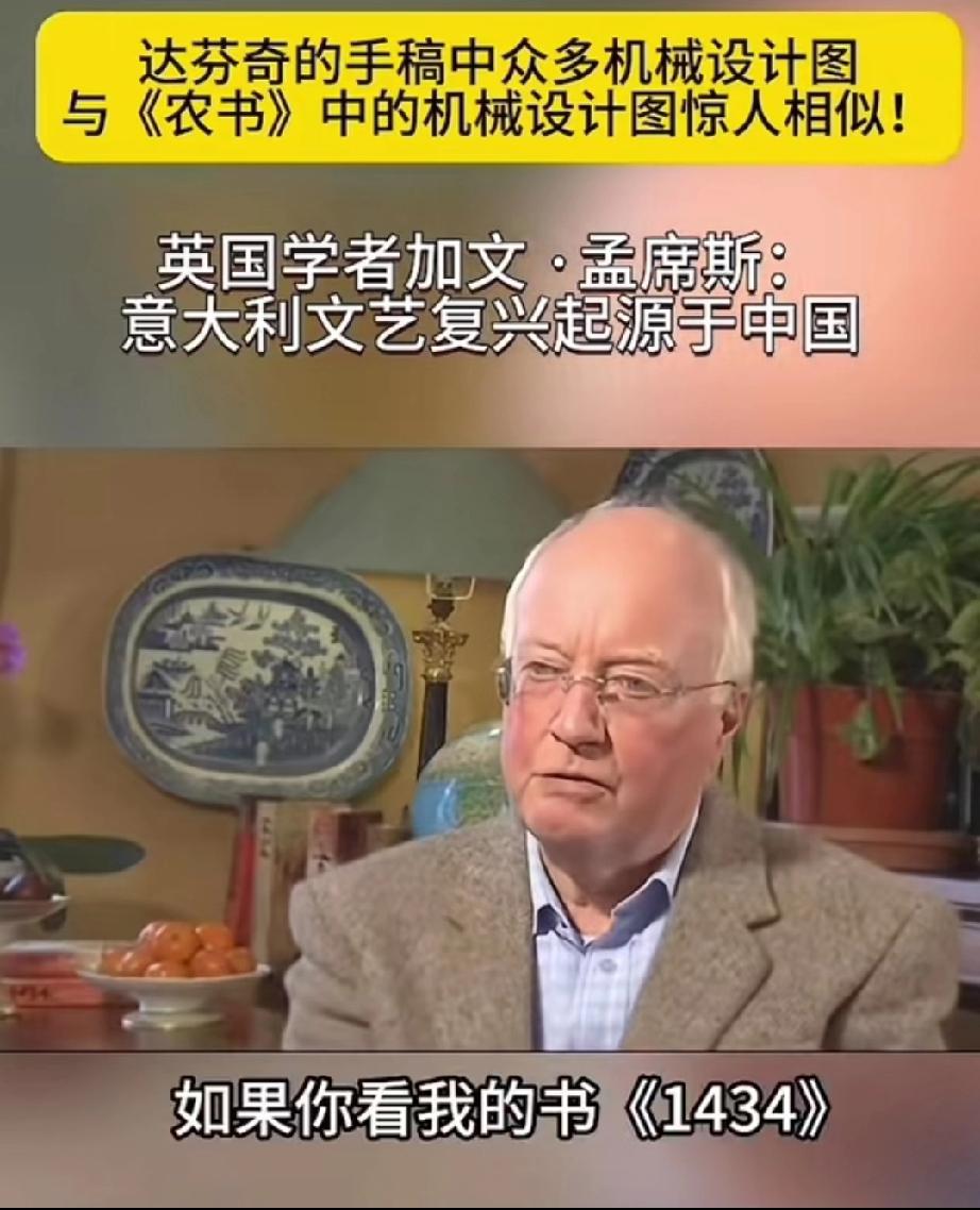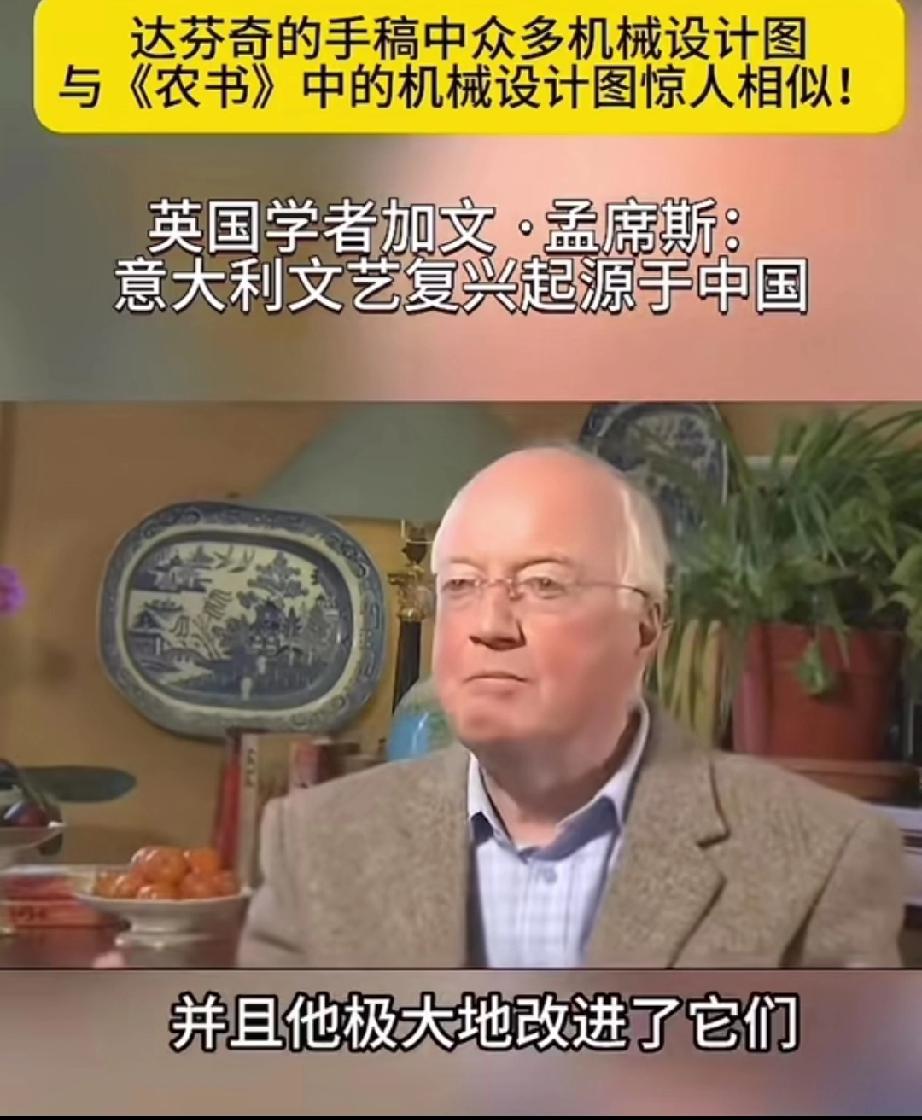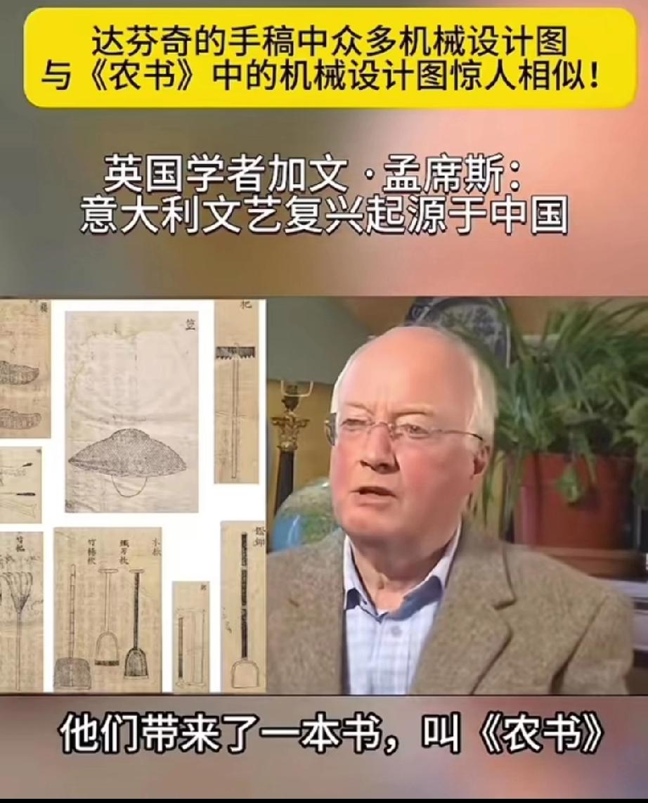 英国学者加文-孟席斯在一档有关西方文艺复兴讨论的栏目里说,意大利的文艺复兴起源于中国,并且他还拿出了证据! 大意就是说,文艺复兴之前西方的传教士去到了中国,他们带来了一本叫做《农书》中国书,农书上面有成百上千张图片,都是关于农业机械的,有教你如何制作水车的,如何制作水管、耙子,以及各种工具,甚至还有如何制造炼钢炉等等!意大利人就是照着书上说的做了才制造出来当时西方没有的各种机械! 他还说莱奥纳多 达芬奇不是人们声称的所谓发明家,相反他是一位改进技术方面的艺术家,因为他拿到了当年意大利的中国图纸的副本,并且极大的改进了它们! 所以他最后总结说,意大利的文艺复兴,实际上是因为中国图片上面的大量机械和知识产生的! 大家觉的这位英国学者说的话可信度高吗?