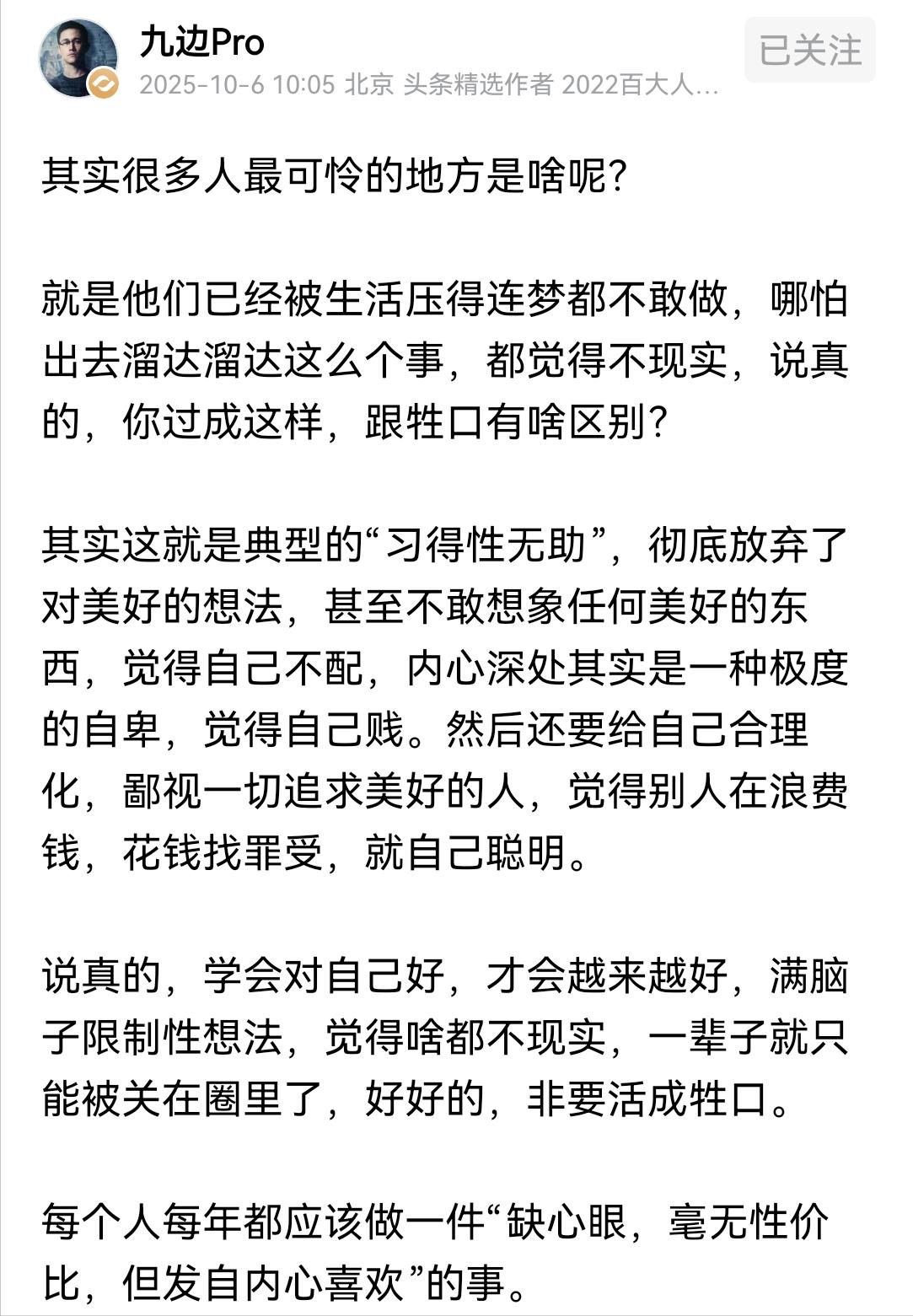 我这个真不是九边的小号! 这几天,有很多粉丝评论问我这个号是不是九边的小号。我问为什么会有如此一问呢?答曰如果不是那为什么一直在发九边的文章。 我这里就统一回答一下。 我本人就是文字工作者,每天都在与文字打交道。每天写的东西也有好几千字,但是都是因为工作原因而写,一般是公文。因为工作的原因,所以也喜欢看头条上的文字,但是看了一圈下来,发现九边的文字无论和自己的年龄、阅历、成长环境还有心理契合度来讲,都是最贴合的,也就是有共鸣。 所以才觉得在读完九边的文字之后,写一点读后感,目前为止,已经写了七十多篇了。 其实每写一篇,都是自己内心总结和梳理的一个过程,也可以把它称为成长吧。 有粉丝说我这些文章就是给九边捧臭脚,如果您硬要这样认为,我也没办法。不过我也不是他的所有观点都赞成的,有些观点不认同,我在文章也直接写明了。 之所以会选择九边的小文来进行梳理和分析,是因为在这个梳理的过程中,自己对事物的看法,对思维的理解,对社会现象的理解,有了更深层次的阅读,主要是对内的阅读,因为写作的过程就是自己对话的过程,在这个过程中,自己将自己看得更清楚了。 这就是我为什么一直发九边的小文分析的主要原因。