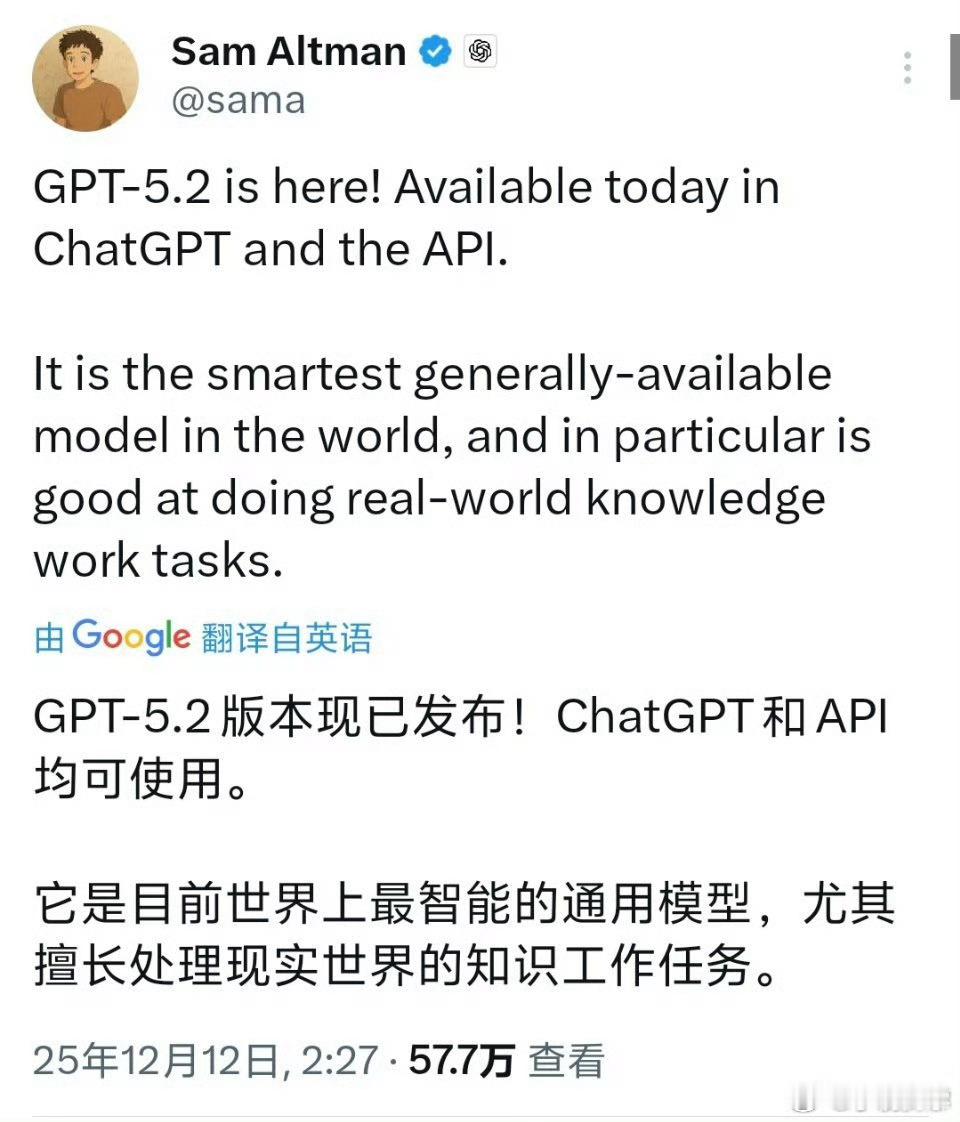 OpenAI发布GPT5.2 今天凌晨,OpenAI提前发出了自己的王牌ChatGpt5.2,用奥特曼话形容,它是目前世界上最智能的通用模型,尤其擅长处理现实世界的知识工作任务。原计划ChatGpt5.2是要作为圣诞惊喜亮相的,看来前不久谷歌发布的Gemini3 给奥特曼的压力不小。OpenAI 表示,GPT-5.2 将提供即时版、思考版和专业版。即时版在文本生成和信息查询方面速度更快,思考版更擅长编码和规划等结构化工作,专业版则为复杂难题提供最精准的解答