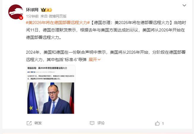 要针对俄罗斯吗?美国将在德国部署远程火力! 12月12日,媒体报道称,2026年美国将要在德国部署远程火力,这个远程意义就不一样了,要知道德国周边几乎都是欧洲国家,而德国等欧洲这些国家和俄罗斯关系一直不是很好,现在乌克兰和俄罗斯打仗,都是欧洲和北约这些国家在捣乱,要不是欧洲和北约,乌克兰早就不行了。所以这次美国在德国部署远程火力真的是在威胁俄罗斯。 据悉部署的这些火力包括,“标准-6”导弹、“战斧”导弹,以及正在研发的高超音速武器。要知道“标准-6”导弹:兼具防空与对地打击能力,射程约500公里;“战斧”巡航导弹:射程达2500公里,可精确打击纵深目标;更加厉害的是高超音速武器,其中像“暗鹰”导弹)射程超3000公里,飞行速度达5000米/秒,10分钟内可飞抵俄境内关键目标。 当然了俄罗斯看到这个消息,肯定不同意美国这么做,随后俄罗斯也表示将采取反制措施。俄罗斯还表示若美方这样做的话,那么俄罗斯将放弃暂停部署中短程导弹的承诺,在白俄境内部署“榛树”远程导弹系统。 不得不说,要是美这样做的话,那么此次部署将被视为北约东扩后对俄最直接的战略挤压,其推进将深度重塑欧洲安全架构。后果真的是让人无法想象。