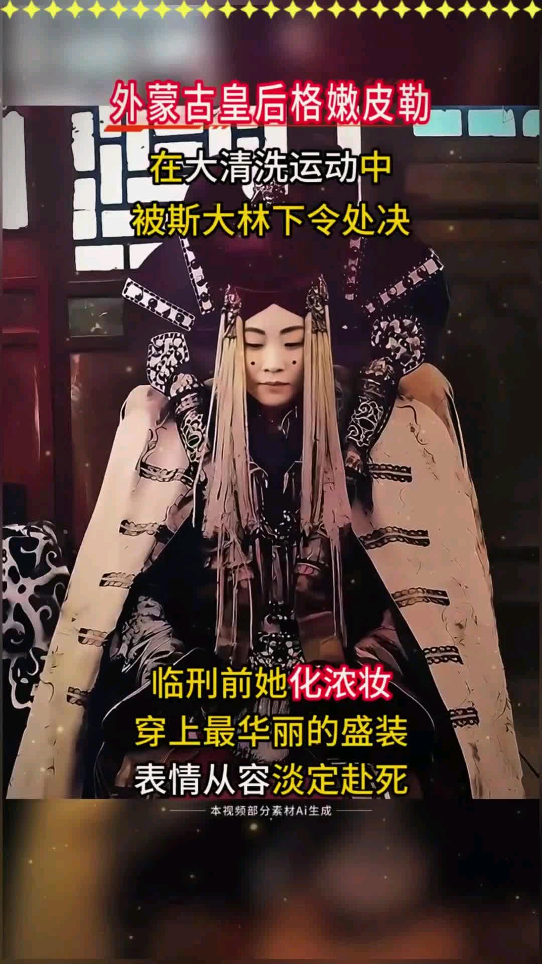 1938年,斯大林下令处决了外蒙古的末代皇后,在执行死刑前,皇后格嫩皮勒展现出与众不同的冷静与坚毅,她毫不动摇地开始为自己化妆,穿上了一袭华丽的民族盛装! 格嫩皮勒1905年出生在外蒙古北部一个牧民家庭,那地方靠近巴尔丹贝雷文寺。她原名叫策延皮勒,从小过着典型的游牧生活,家里靠放羊为生。父母是普通牧民,她帮着挤奶和赶羊群,长大后本该嫁人,继续这种日子。但1923年,一切变了。外蒙古当时的统治者博克多格根,也就是第八世哲布尊丹巴活佛,他的第一位皇后东多格杜拉姆去世。他年事已高,还失明,需要选新皇后来维持国家体统。全国范围内挑选,格嫩皮勒因为长相出众被选中。那时她19岁,从没想过会进宫。 结婚后,她成了博克多格根的妻子,但这段婚姻持续不到一年。博克多格根1924年5月20日去世,享年54岁。君主制随之废除,外蒙古转向新方向。格嫩皮勒之前有过一段婚姻,可能和一个叫鲁夫桑丹巴的人,离开宫廷后她返回家乡,和家人团聚,继续普通生活。她甚至在1924到1938年间可能和前夫重聚或结婚,远离政治。但她的皇后身份像个标签,甩不掉。 谁能想到,一个早已褪去凤冠、回归草原的普通女人,终究没能逃过政治漩涡的吞噬。1938年的苏联,正处在斯大林大清洗的恐怖阴影下,这场风暴早已越过边境,席卷了作为苏联卫星国的外蒙古。当时苏联为了彻底巩固在外蒙古的控制权,正疯狂镇压所谓的“封建残余势力”和“反苏分子”,只要和旧君主制沾过一点边,哪怕只是曾经的身份符号,都可能被罗织罪名,送上断头台。格嫩皮勒的“末代皇后”身份,在这场政治清洗里,成了压垮她的致命枷锁,哪怕她十几年里从没涉足过政坛,每天只想着放羊、挤奶,守着家人过安稳日子。 被抓捕后的格嫩皮勒,没有哭天抢地的求饶,也没有歇斯底里的反抗,她比所有人都清醒,自己面对的不是公正的审判,而是赤裸裸的政治屠杀。所以行刑前,她要对着简陋的镜子仔细化妆,把每一丝乱发梳理整齐,再穿上那件最华丽的民族盛装——那不是女人爱美的虚荣,是一个蒙古女人最后的尊严坚守,是对那些想摧毁旧时代象征、践踏她人格的人的无声反抗!她要用最体面的样子离开这个世界,告诉所有人,哪怕命运不公,哪怕强权压顶,她骨子里的骄傲和骨气,从来没被打垮过。 很多人不知道,当时外蒙古的肃反运动有多残酷,短短几年里,大量王公贵族、宗教人士甚至普通牧民,都因为莫须有的罪名被处决或流放,格嫩皮勒只是这场灾难里无数受害者之一。但她和别人不一样,她没有在恐惧里沉沦,而是用一身盛装、一脸从容,给黑暗的时代留下了一抹倔强的亮色。斯大林处决她,看似是清除封建残余,本质上不过是为了用高压手段震慑人心,让外蒙古彻底断绝对旧时代的念想,乖乖依附于苏联的掌控,所谓的罪名,从来都是政治博弈的借口。 从草原上挤奶赶羊的姑娘,到一朝入宫的皇后,再到被强权碾压的阶下囚,格嫩皮勒的一生像一场跌宕的梦,起起落落全不由己。可哪怕结局注定悲惨,她也用最后的姿态,活出了骨子里的高贵。比起那些为了苟活不惜背叛良知的政客,这个没什么权力的末代皇后,反而更让人敬佩。她的冷静不是麻木,是看透世事的通透;她的坚毅不是逞强,是对人格尊严的誓死捍卫。 各位读者你们怎么看?欢迎在评论区讨论。