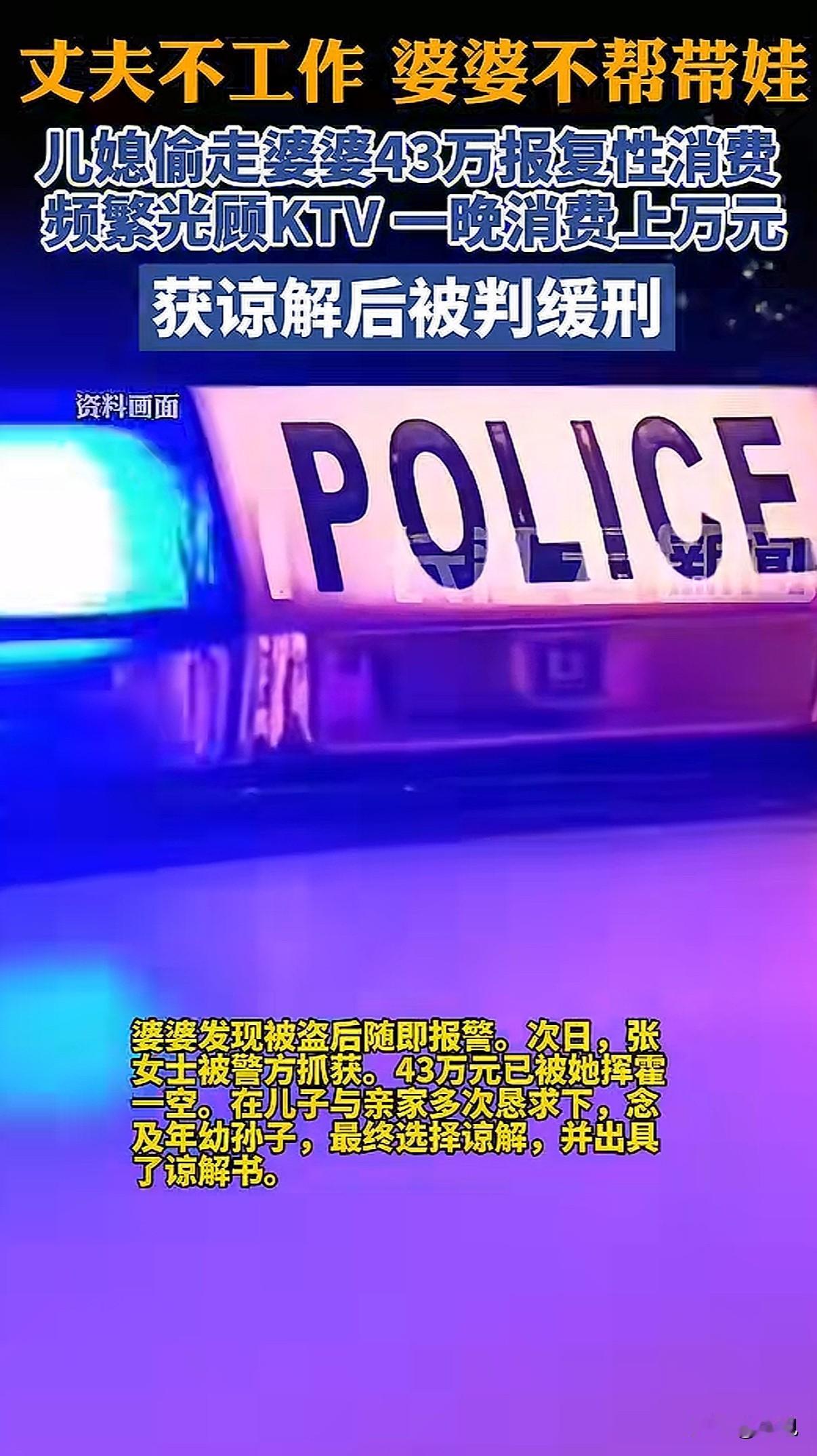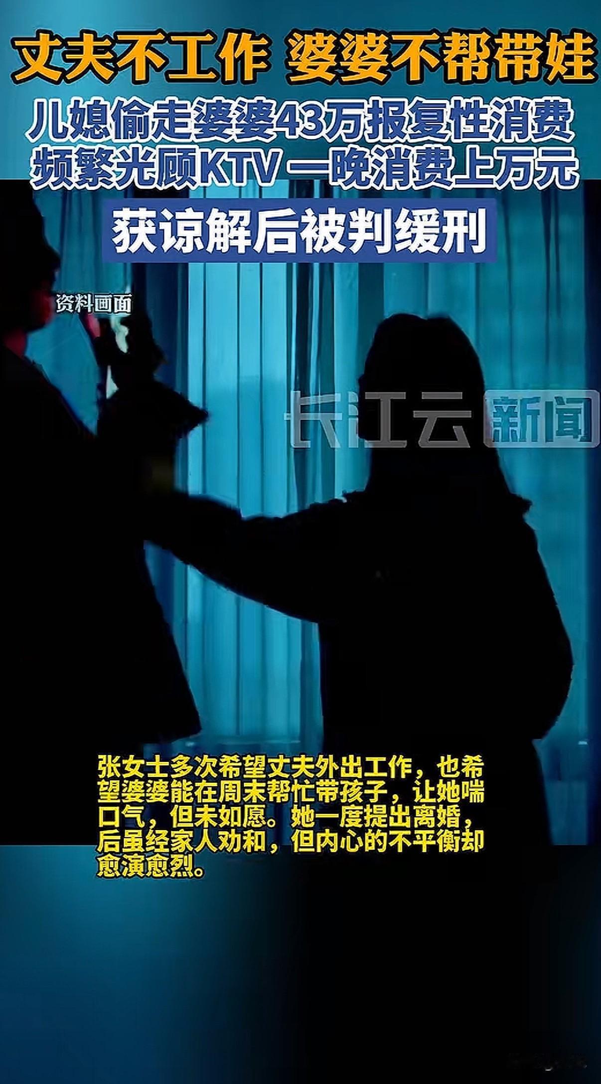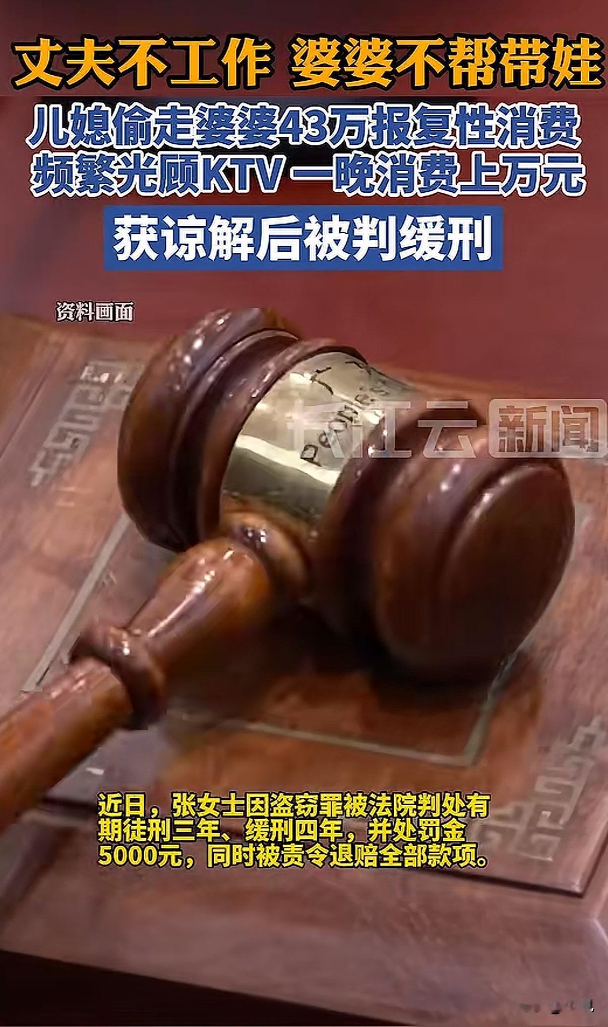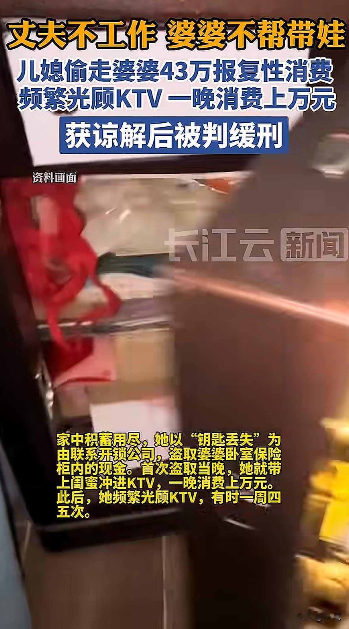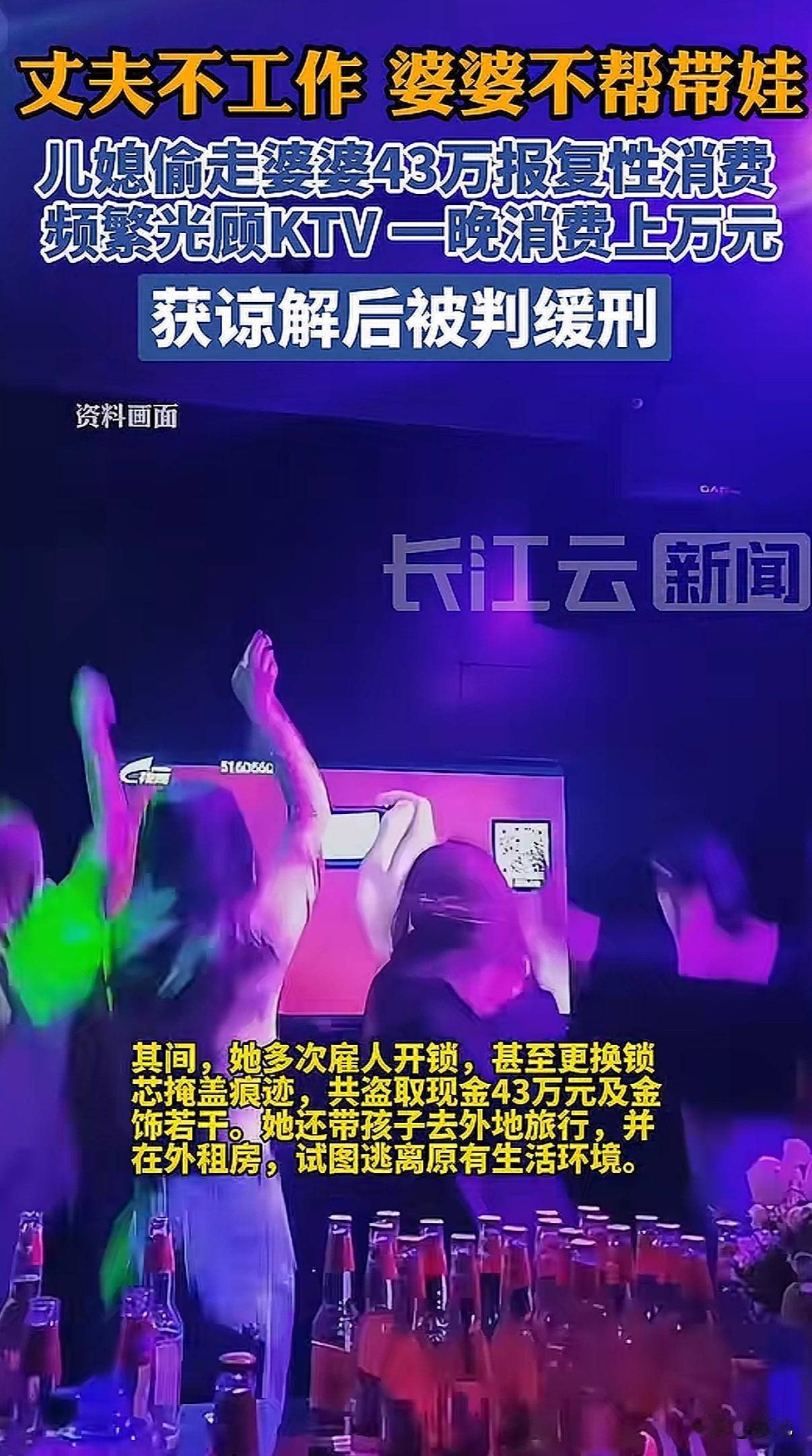 00后儿媳偷了婆婆43万,40天挥霍一空,结果判三缓四,不用坐牢。 这事发生在湖北宜昌。 张艾拉(化名),00后,2022年结婚,生了孩子,就在家全职带娃。她丈夫没有固定工作,家里开销,全靠婆婆每月给的三千块生活费,还有当初结婚留下的那点彩礼钱撑着。 日子紧巴巴,矛盾就出来了。 她跟丈夫提过,让他出去找个正经工作。她也跟婆婆商量,周末能不能帮忙带带孩子,让自己喘口气。 但这些话,好像都掉进了井里,没听见回音。 钱越来越少,心里的怨气越积越多。 2025年3月,家里的积蓄快见底了。张艾拉把目光转向了婆婆卧室里的那个保险柜。 她开始行动。先是跟家里人说,保险柜钥匙“弄丢了”。然后,她雇了开锁师傅上门。 一次没拿完,就再找借口叫师傅。为了不让人发现,她甚至把整个锁芯都换掉了。 就这样,前后从保险柜里拿走了43万元现金,还有一些金首饰。 钱到手那一刻,她像变了个人。 当天晚上,她就叫上闺蜜,冲进一家高档KTV,唱歌喝酒,一晚上花掉一万多。 从那以后,她彻底“放飞”了。一周有四五天都泡在娱乐场所。短短一个月,就在同一家KTV消费超过十万,办上了最高等级的“至尊黑卡会员”。 她还带着孩子出去旅游,在外面租房子住,好像这样就能彻底离开那个让她透不过气的家。 43万是什么概念?她只用了40多天,就花得一分不剩。平均下来,每天就要用掉将近一万块钱。 买的东西呢?有报道提到,光是没开封的高档酒水就存了不少,还有各种包场消费。 2025年5月4号,婆婆终于察觉到不对劲。保险柜的锁芯怎么是新的?她马上报了警。 第二天,张艾拉就被抓了。 婆婆一开始非常坚决,一定要追究责任。但后来,情况变了。 儿子求她,亲家也上门求情。最重要的是,她看着还那么小的孙子,心软了。 最后,婆婆出具了谅解书。 法院的判决最近下来了:盗窃罪,数额特别巨大,判处有期徒刑三年,但缓刑四年执行,并处罚金五千元,同时责令她退赔全部赃款。 这就是说,只要在四年缓刑期内不犯事,她就不用去坐牢。 很多人看到“偷43万判缓刑”,第一反应是不理解。偷这么多,怎么不用坐牢? 法官和检察官的解释是,考虑到她们是姻亲关系,属于家庭内部矛盾,而且她认罪态度好,婆婆也谅解了,符合“宽严相济”的刑事政策。 法律条文之下,是一个家庭的千疮百孔。 这不是简单的“儿媳坏”或者“婆婆惨”的故事。它像一面镜子,照出了一些更复杂的东西。 一个二十出头的年轻妈妈,被拴在孩子和家庭里。丈夫没有承担起经济责任,婆婆的沟通是无效的。她感觉自己被困住了,孤立无援。 那43万,对她来说可能不只是钱。是一种报复,也是一种扭曲的出口。她用最快最烈的方式,去购买一种“自由”和“存在感”,哪怕那是虚幻的。 而婆婆最后的选择,与其说是原谅了儿媳,不如说是向现实妥协了。为了儿子的小家庭能勉强维持,为了孙子能有个妈在身边。 判决结果出来后,这个家还得继续往下过。但裂痕就在那里,43万的窟窿要补,心里的疙瘩更难消。 最让人唏嘘的是那个始终没有清晰面孔的丈夫。在整个事件里,他似乎一直是缺席的。直到要母亲出具谅解书时,他才出现。 一个家的坍塌,很少是因为一次突然的盗窃,往往是日积月累的失责与冷漠,把每个人都逼到了角落。 这件事,很难说谁全对谁全错。它留给我们的,更多是关于婚姻责任、家庭支持和心理健康的思考。日子是过出来的,不是偷出来的,也不是靠一个人硬撑出来的。
