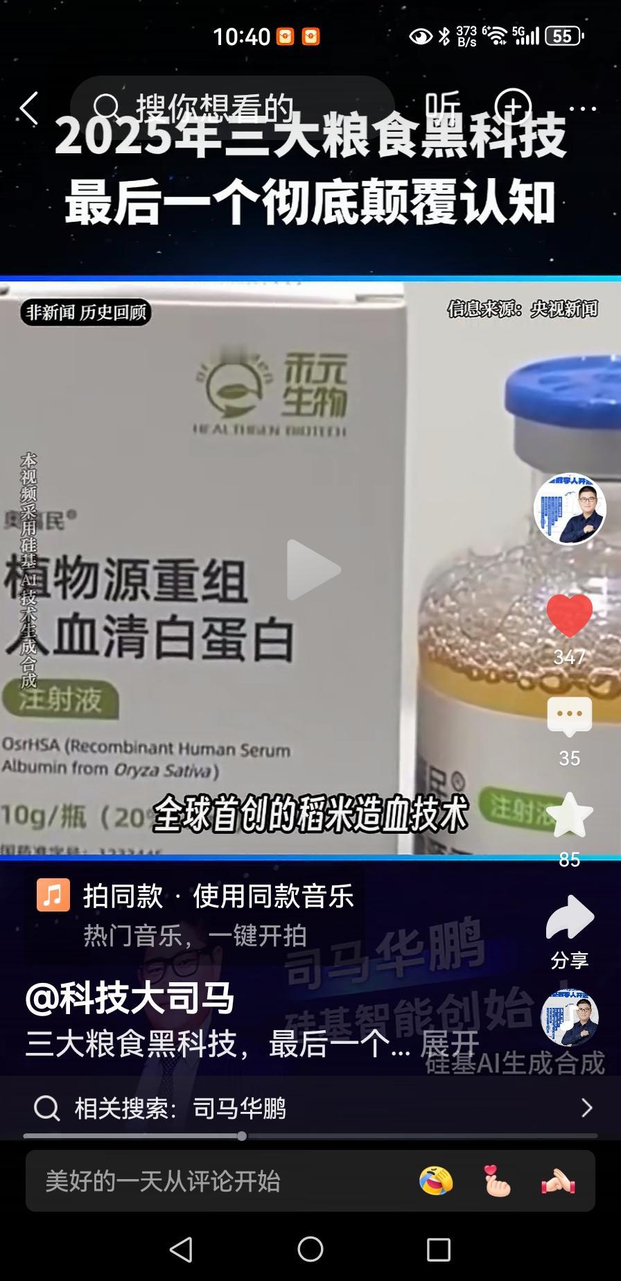 再一次分享科技大司马的作品。 大米造血! 节目中说,只要有大米,就能工业化生产人造血浆,而且与人类血浆高度相近,纯度高达99.9%!完全可以代替人类血液。 或许,献血,这个与疾病作斗争的武器,从此成为历史!