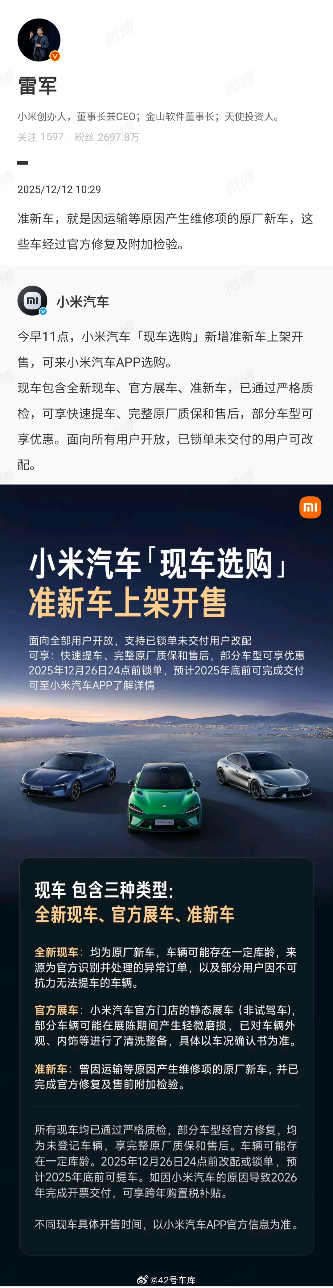 小米的准新车上架开售了,雷军解释了下准新车的定义:就是因运输等原因产生维修项的原厂新车,这些车经过官方修复及附加检验。又到了拼手速的时候?42how小米汽车 小米汽车准新车开售