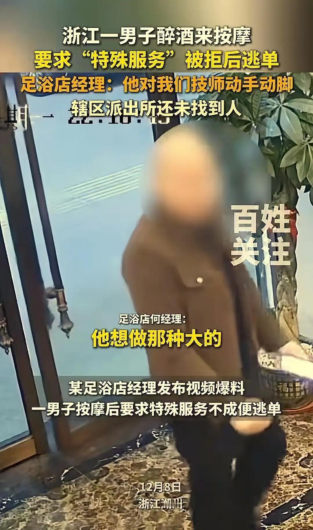 浙江湖州,男子醉酒后去按摩,对女技师动手动脚,还要求女技师提供“特殊服务”!女技师又羞又怒,说自己不是随便的女人,只做正规按摩!而男子被拒后,觉得这钱花的不值,居然选择了逃单。足浴店气愤不过,选择报案! 男子满身酒气走进店里,躺下没几分钟,手就开始不老实,不是往女技师身上蹭,就是讲些不堪入耳的话。女技师躲开几次,明确告诉他这里只有正规按摩,请他放尊重点。 醉酒男子一听更来劲了,直接提出过分要求,觉得花钱消费就是要享受。女技师又气又委屈,立刻停下手里的活,严肃地告诉他:“我们是正经生意,你再这样我就叫经理了。” 被严词拒绝后,男子觉得面子上挂不住,也认为自己“没享受到想享受的”,这按摩钱花得冤枉。趁着女技师出去叫人的空档,他竟衣服一披,晃晃悠悠地溜出门,没付钱就走了。 前台和经理追出去,人早已不见了踪影。一次正规的按摩服务,被无端骚扰,最后还遭遇逃单,店里觉得这事实在太憋屈。他们果断调取监控,向派出所报了警。 民警根据监控很快找到了这名男子,面对证据,他酒也醒了,支支吾吾地辩解自己当时“喝断了片”,行为不受控制。可“喝多了”从来都不是侵犯他人、破坏规矩的理由。 任何职业都该得到尊重,女技师的劳动和服务,不是客人酒后撒野的理由。挂着“顾客是上帝”的牌子,也不是某些人可以为所欲为的通行证。 商家提供明确的服务,你接受就消费,不接受可以离开。用骚扰、逃单这种低级方式解决问题,最后只会让自己更难堪。贪图那点按摩费的小便宜,换来的可能是警方的传唤和留档,名声扫地,得不偿失。 成年人的体面,在于清醒时守规矩,更在于醉了也能管住自己。尊重别人的职业边界,就是守住自己为人的底线。别让几杯黄汤,灌丢了自己的脸面和基本的教养。 各位读者你们怎么看?欢迎在评论区讨论。