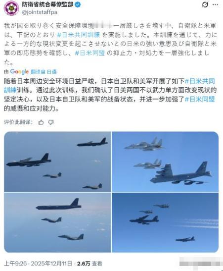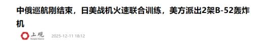 无视中俄警告,美军派B52给高市早苗助威,8架歼-16不给F-15J机会 2025 年 12 月 11 日大清早,美军和日本自卫队急匆匆搞出的联合巡航,与其说是 “武力威慑”,不如说是场自欺欺人的撑场面大戏。 美国太平洋空军司令部和日本防卫省一前一后发帖官宣:美军出动 B-52 战略轰炸机,日本航空自卫队派 F-15J 护航,号称要 “展示战备能力”“强化同盟威慑”。可明眼人一看就懂,这不过是中俄联合巡航震慑下的应激反应,连掩饰心虚的姿势都透着笨拙。 这事得从两天前的中俄行动说起。12 月 9 日,中国轰 - 6K 和俄罗斯图 - 95MS 轰炸机组成编队,从宫古海峡直插西太平洋,一路飞到距离东京仅 650 公里的空域才掉头返航。 这可不是随便逛逛 —— 俄军还搭配了苏 - 30SM 战机和 A50 预警机,摆出实战化队形,等于把 “警告” 直接贴在了日本家门口。俄安全会议秘书绍伊古更直白:高市早苗政府力推 “防卫费占 GDP 2%”,这是北约的标准,“东方北约的胚胎正在形成”,俄罗斯绝不会坐视不理。 高市早苗心里门儿清自己踩了红线。她上台后搞的动作一连串:修宪解禁集体自卫权、琢磨引进核潜艇、防卫费连续 13 年暴涨,去年日本五大军工企业收入直接涨了 4 成。中俄这次联合巡航戳中了她的痛处,急吼吼找美国 “爸爸” 撑腰。可美国给的 “支持”,实在掺了太多水分。 先说这出动的装备 —— 纯纯的 “老古董组合”。B-52 轰炸机服役快 60 年了,机身比不少飞行员的爹岁数都大;F-15J 更夸张,平均服役 40 多年,发动机还是上世纪的 F100-PW-220E,推力才 10.5 吨,结构疲劳问题早就不是秘密。 反观中俄,轰 - 6K 能挂巡航导弹精准打击,图 - 95MS 载弹量惊人,更别说背后还有预警机指挥、航母策应的体系化支撑。美军自己也心虚,压根不敢把 B-52 往东海或琉球群岛派 —— 那里有辽宁舰编队盯着,只能躲到日本海上空转圈,连具体训练科目都不敢公布,只含糊说 “战术协同”。 更打脸的是空中对峙环节。就在美日巡航前几天,12 月 6 日,一架 F-15J 就曾主动挑衅歼 - 16,结果被中方雷达照了两次,灰溜溜撤了。11 日这天,美军刚摆开架势,中国空军 8 架歼 - 16 直接升空,不给 F-15J 任何嚣张的机会。 别小看这 8 架战机 —— 歼 - 16 用的 WS-10C 发动机推力 13 吨,比 F-15J 强出一截,还装了有源相控阵雷达,探测距离和精度都碾压对手。有消息说,歼 - 16 编队直接在日本海边缘形成警戒圈,雷达全程锁定美日机群,F-15J 连靠近中俄空域的胆子都没有,更别提所谓的 “威慑” 了。 这场景把美国的 “霸权虚火” 露得明明白白。想当年美军在亚太说一不二,如今派个老掉牙的 B-52,连自家 F-22、F-35 隐身战机都不敢出动,全靠日本的 F-35A 撑场面 —— 可日本总共才几架 F-35?根本形不成规模优势。 说白了,美国就是想拿最小成本给日本画饼,既不想真跟中俄翻脸,又怕盟友跑了,只能搞这种 “嘴炮 + 摆拍” 的套路。 高市早苗其实也没指望美国真动手。她要的只是 “美国撑腰” 的舆论效果,好给国内右翼造势。可这戏演砸了 —— 中俄巡航是年度计划,中方早说了 “日方没必要对号入座”,反倒是日本急着跳出来认账,暴露了做贼心虚。 美日刚宣完 “威慑力”,就有网友发现,日本海自的 “加贺” 号准航母当天直接躲进了港口,根本不敢出来露面。 不过咱们也得警惕 “狗急跳墙”。美国霸权虽在衰落,但从不甘心退居二线;高市早苗这类右翼政客,为了选票什么冒险事都可能干。这次 F-15J 没占到便宜,保不齐他们下次会搞更激进的挑衅。 比如派 F-35 闯敏感空域,或者在台海问题上煽风点火。但中俄的实力摆在这里:歼 - 16 总量已经超过 350 架,中俄联合巡航都到第 10 次了,体系化作战能力早不是美日临时拼凑的编队能比的。 说到底,这场闹剧就是帝国衰落的缩影。美国想靠老古董轰炸机维持存在感,日本想借外人的威风走军国主义老路,可时代早变了。 12 月 11 日的天空已经给出答案:8 架歼 - 16 不给 F-15J 机会,就像中俄联手不给 “东方北约” 萌芽的机会 —— 谁想破坏地区稳定,就得先掂量掂量自己的分量。