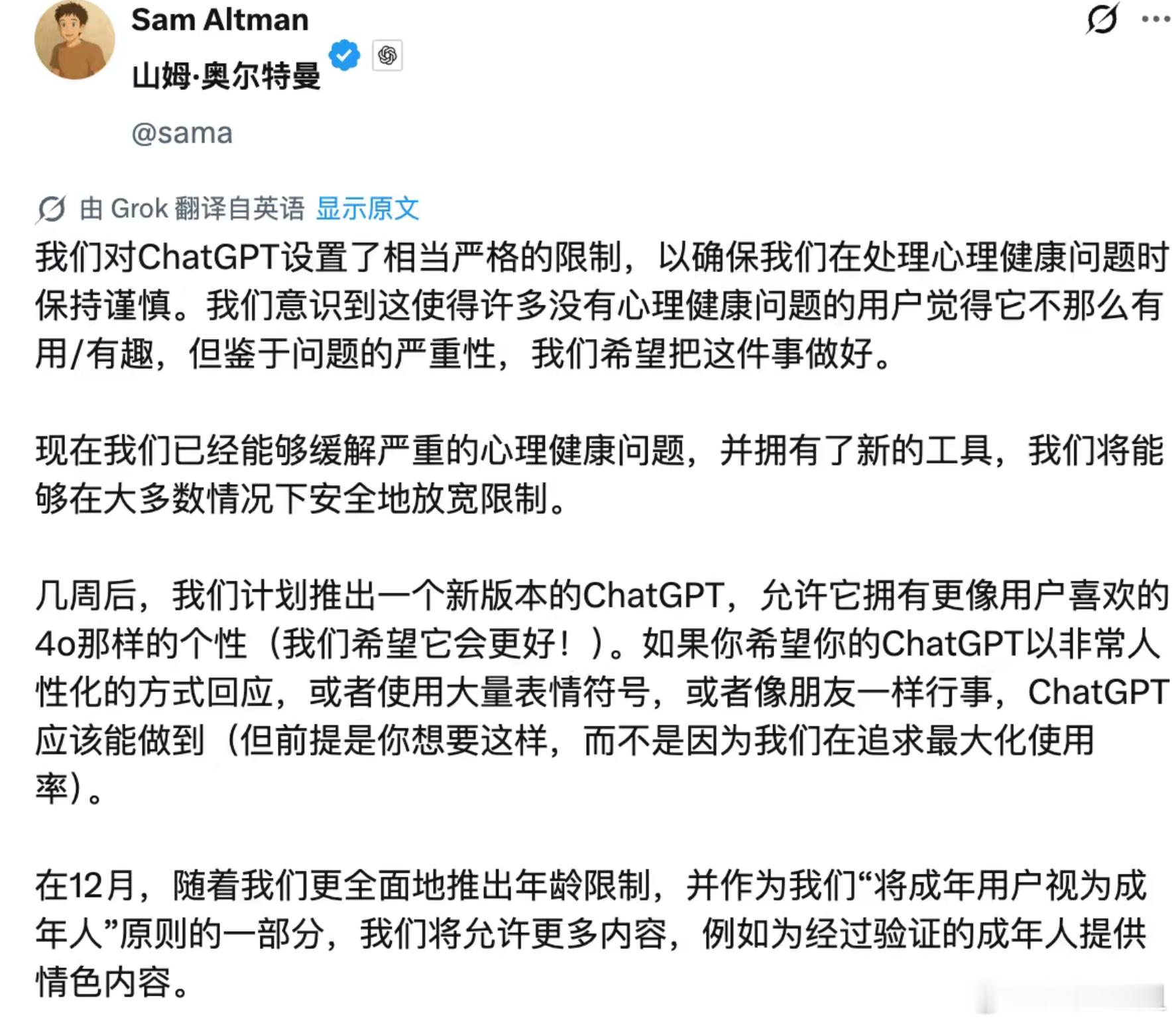 ChatGPT成人模式或明年一季度上线 Grok有 X 这个平台提供数据,要什么有什么,主打一个「野蛮暴力」 GPT靠 Reddit和Tumblr的数据,估计很难训练出Grok 这种精通各种「爱好」懂人性且没有道德包袱的 AI