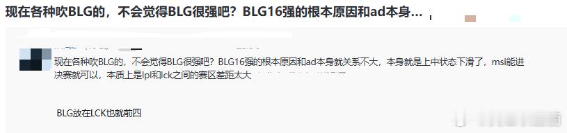 你怎么看?网友:现在各种吹BLG的,不会觉得BLG很强吧?BLG16强的根本原因和ad本身就关系不大,本身就是上中状态下滑了,msi能进决赛就可以,本质上是lpl和lck之间的赛区差距太大BLG放在LCK也就前四chovy获2025tga最佳电竞选手Homme调侃Kanavi能赢T1英雄联盟英雄联盟