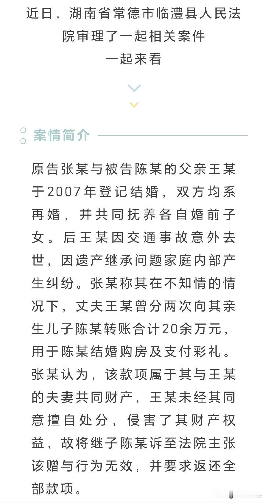 笑死了,父亲生前给亲儿子20万用于结婚买房,这属于人之常情。结果人刚走,继母跳出来搞事情了,说“给钱的时候,我不知道,这钱得还我”。法院最后都看不下去了认为,作为亲生父亲,在自身经济条件允许的情况下支持子女结婚,是正常的。而且俩人收入一般,妻子对家庭的大额支出“不知情”,这不符合常理。 给子女结婚用的钱,又不是乱花,凭什么还?丈夫走了,对继子好点,继子念着你的好,没准以后会善待你。这操作,真让人看不懂。