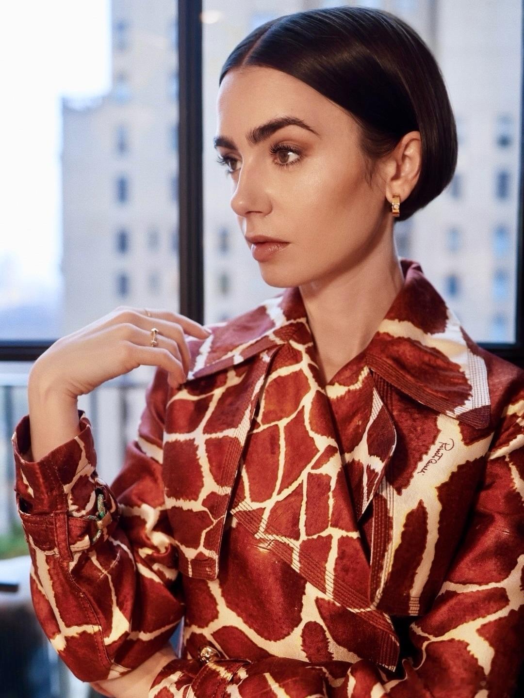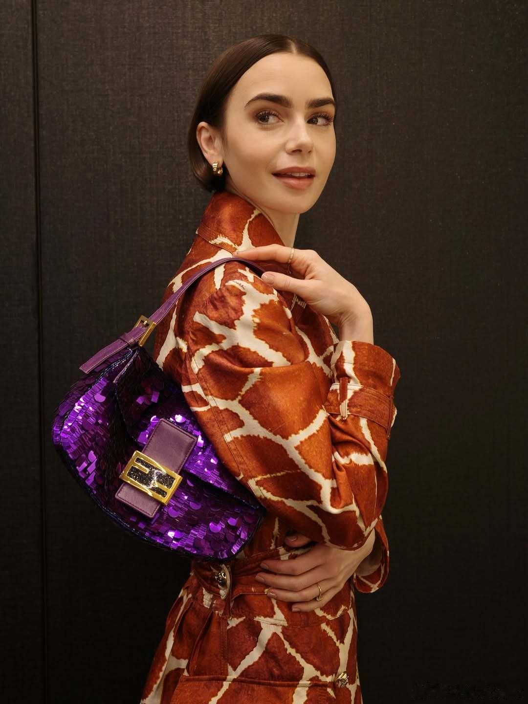 lily collins莉莉柯林斯宣传《艾米丽在巴黎》第五季的另一套造型,包包是非常经典的《欲望都市》同款芬迪法棍包