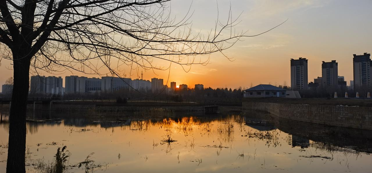晒图笔记大赛步行途中,拍到的落日景色及其倒影在静静的丹河中的倒影