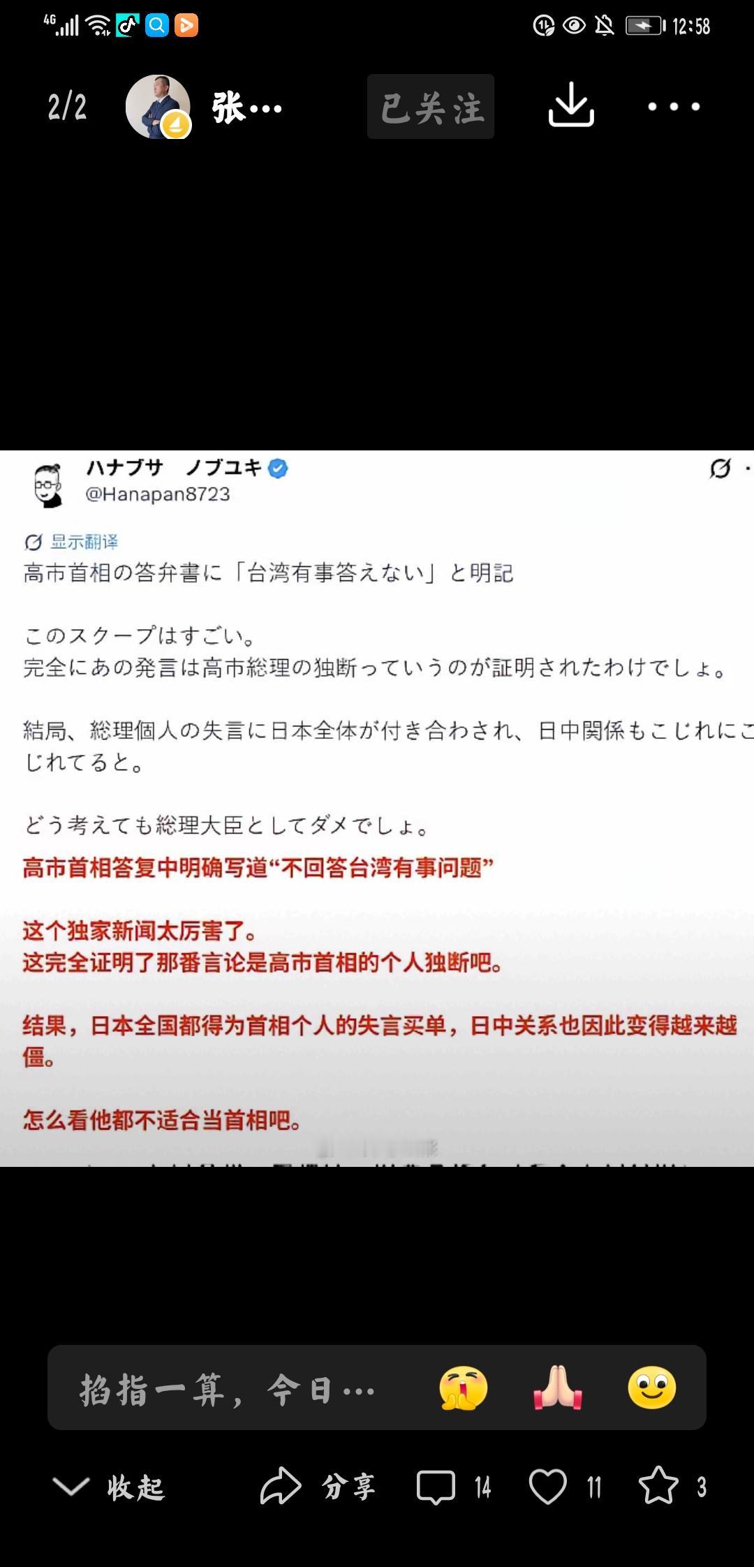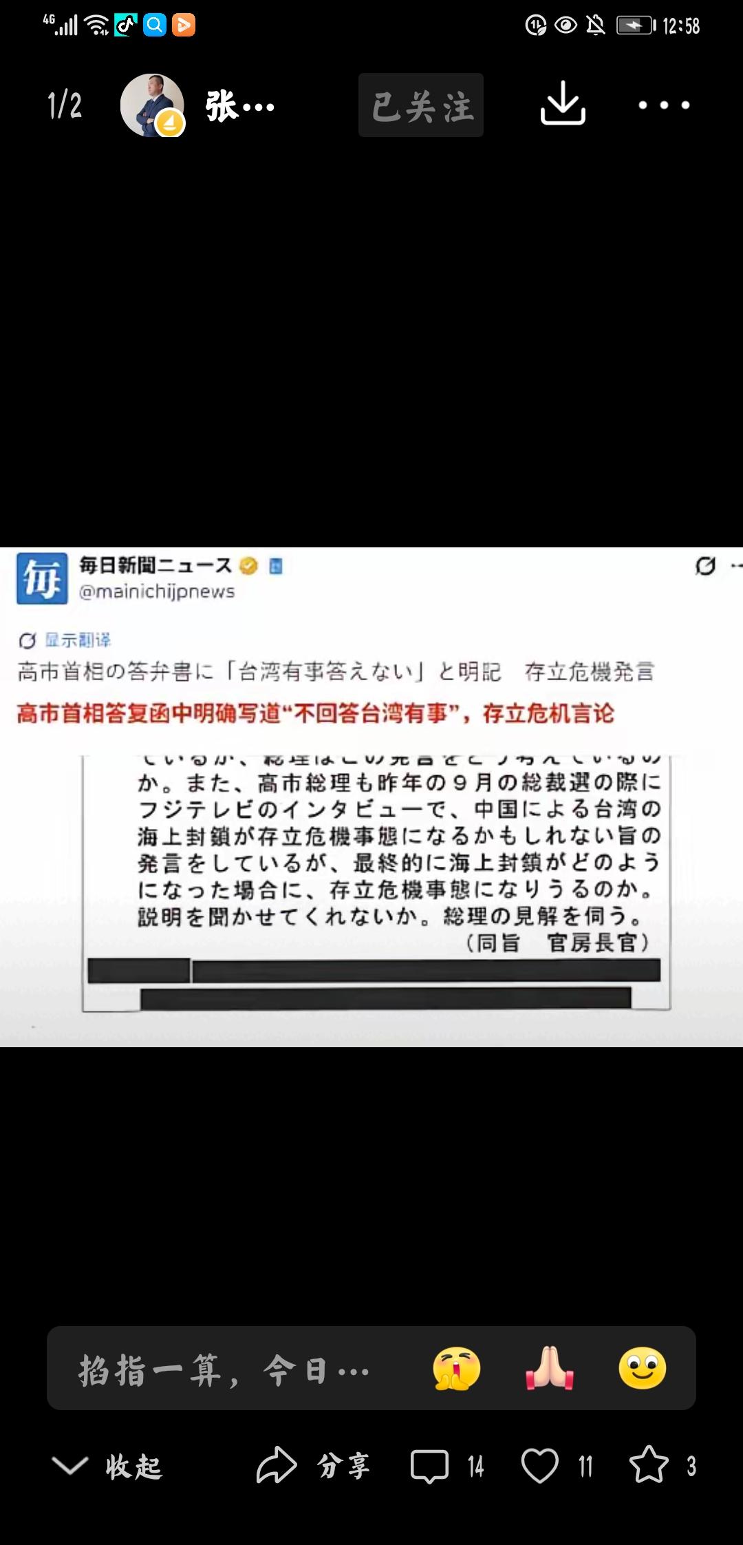中国不答应:日本让高市当背黑锅者 个人观点:中国人早己预判,日本早晚会耍这种小把戏,把高市推出来,充当背黑锅者。推卸责任,鞠躬道歉,宣称现在与高市造成的背信弃义(不承认1945年无条件投降书,不承认开罗宣言,不承认波茨坦公告,不承认战败国这一事实)无关联,一刀两断。然后面带微笑,宣传重新开始,中日友好。 日本是在做着春秋大梦,痴心妄想。 我们没有忘记国耻,看看九天无人机,看看国防科大研发的“等离子护盾”。 我们就是让日本接受战败国的责任与义务,承认1945年无条件投降书,承认开罗宣言,承认波茨坦公告,就要将日本去军事化,就要执行开罗宣言,波茨坦公告所规定的日本国土。