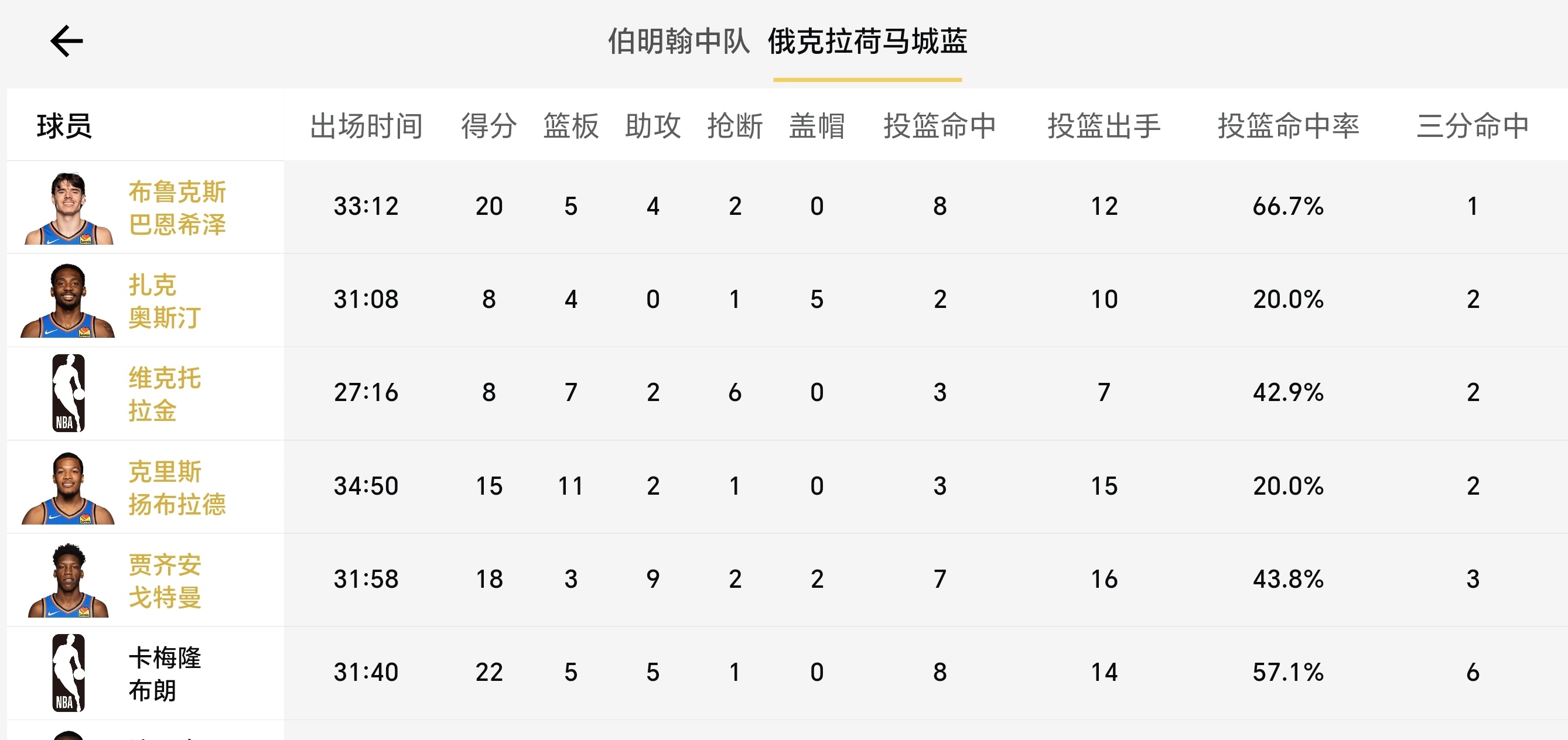 在刚刚结束的一场G联赛比赛中,小蓝队101-103输给了伯明翰中队(鹈鹕下属球队)!巴恩海泽12中8砍下20分5篮板4助攻2抢断,扬布拉德三分10中2得到15+11,怀特海德4中0没有得分!雷霆晋级nba杯半决赛雷霆大胜太阳49分雷霆