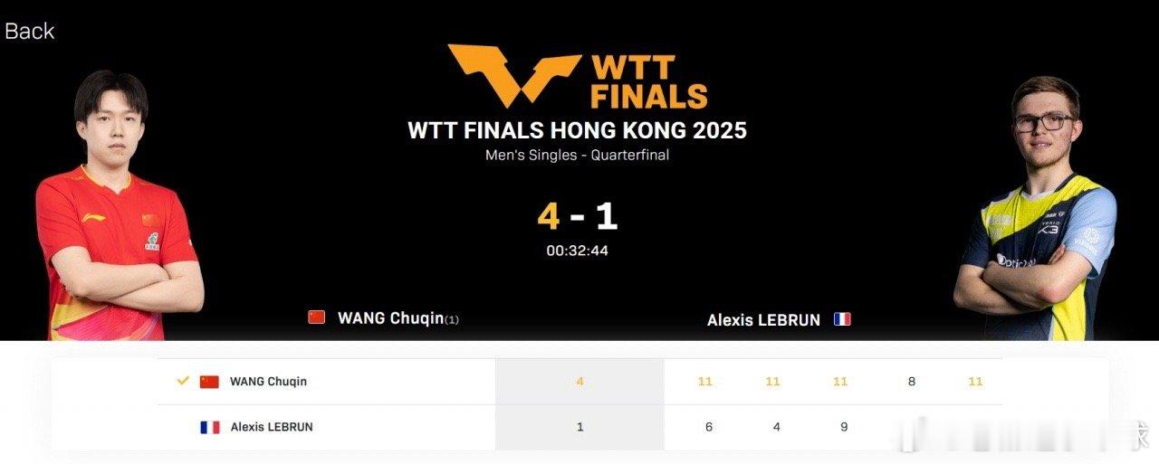 WTT总决赛男单1/4决赛,王楚钦对阵亚历克斯·勒布伦。王楚钦前3局攻势如潮,最终仅用时32分钟,以4-1击败对手强势晋级4强。