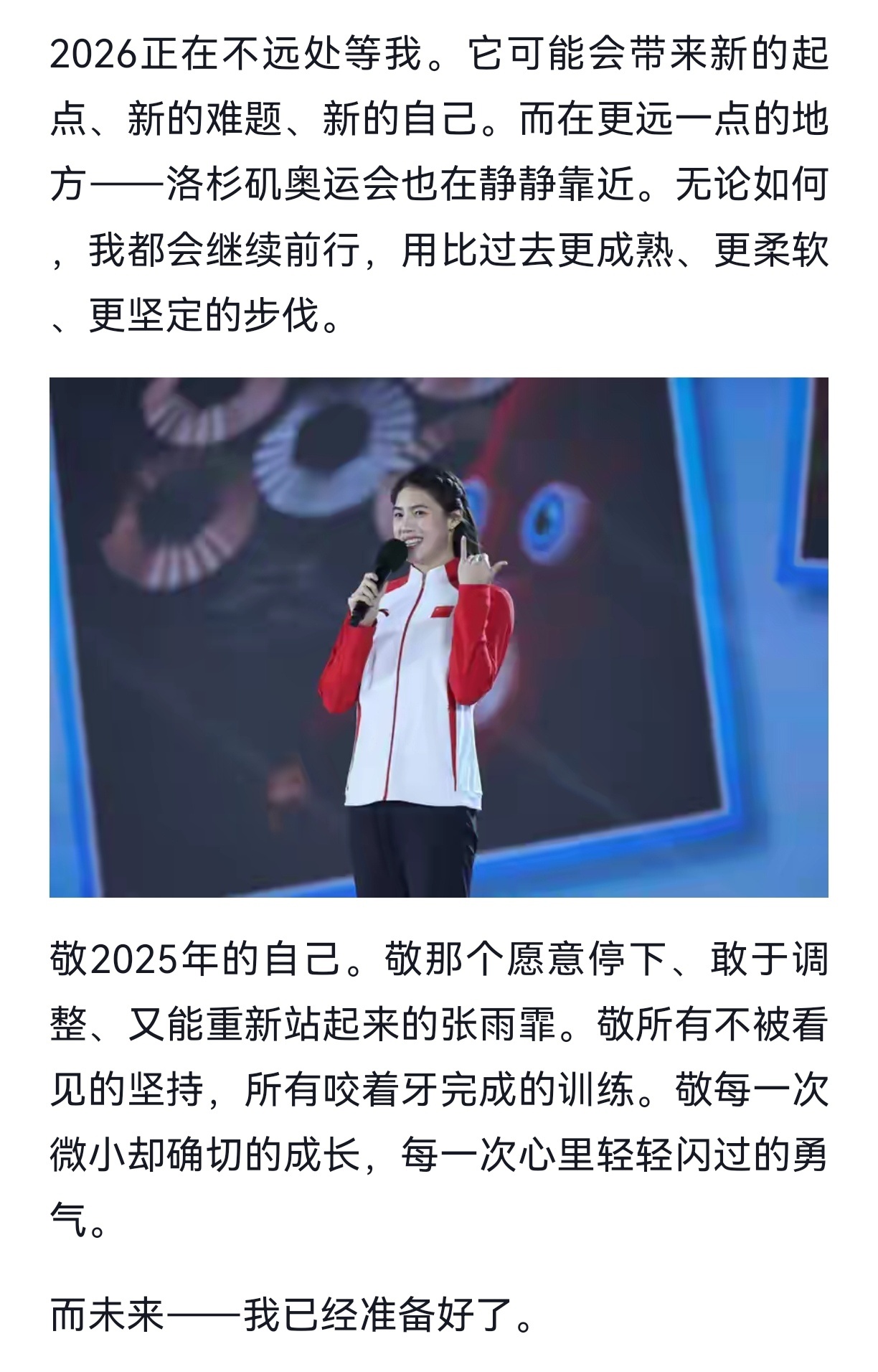 张雨霏发长文回顾自己的2025张雨霏在社媒发长文回顾自己的2025。坦言:这一年,对我而言,是“重启”的一年。展望洛杉矶奥运会,她说自己无论如何,都会继续前行,用比过去更成熟、更柔软、更坚定的步伐。