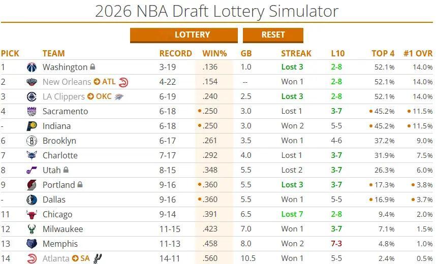 快船战绩6胜19负,联盟倒数第三,明年拿到状元签的概率来到14%,和奇才、鹈鹕并列第一,但快船这个首轮签属于雷霆。