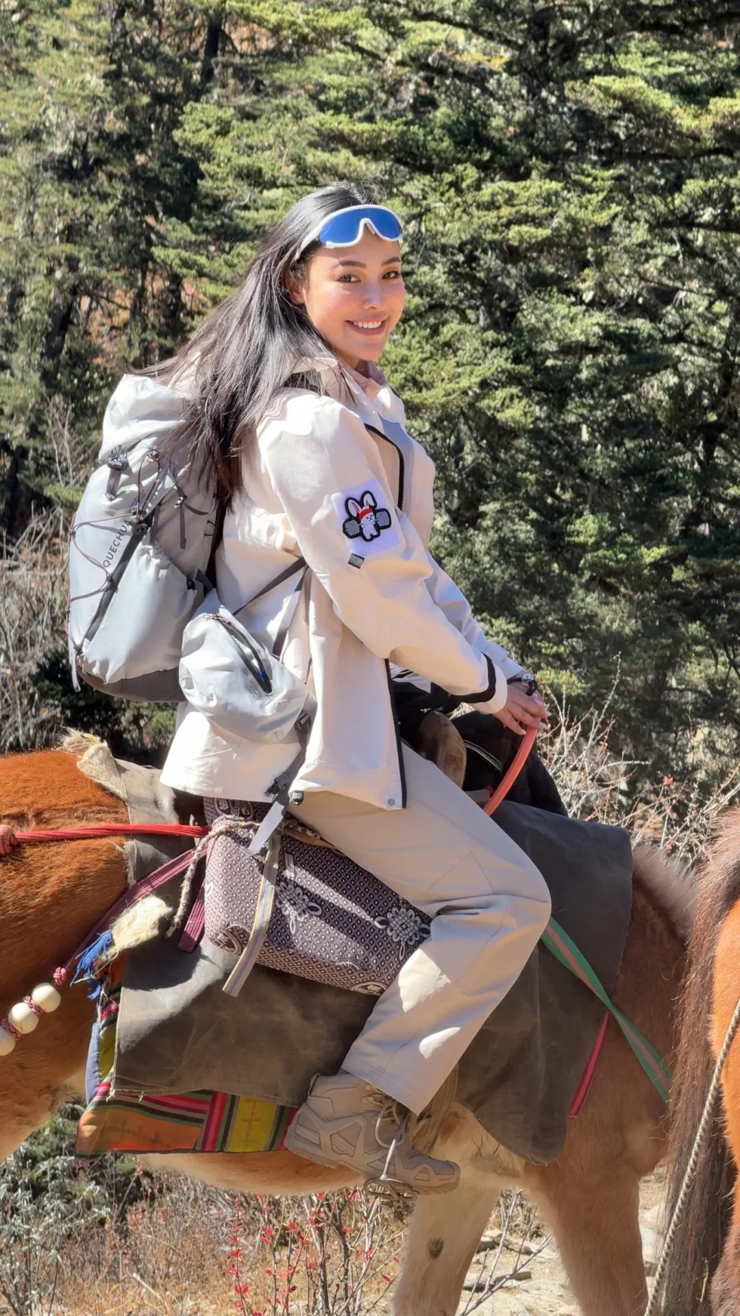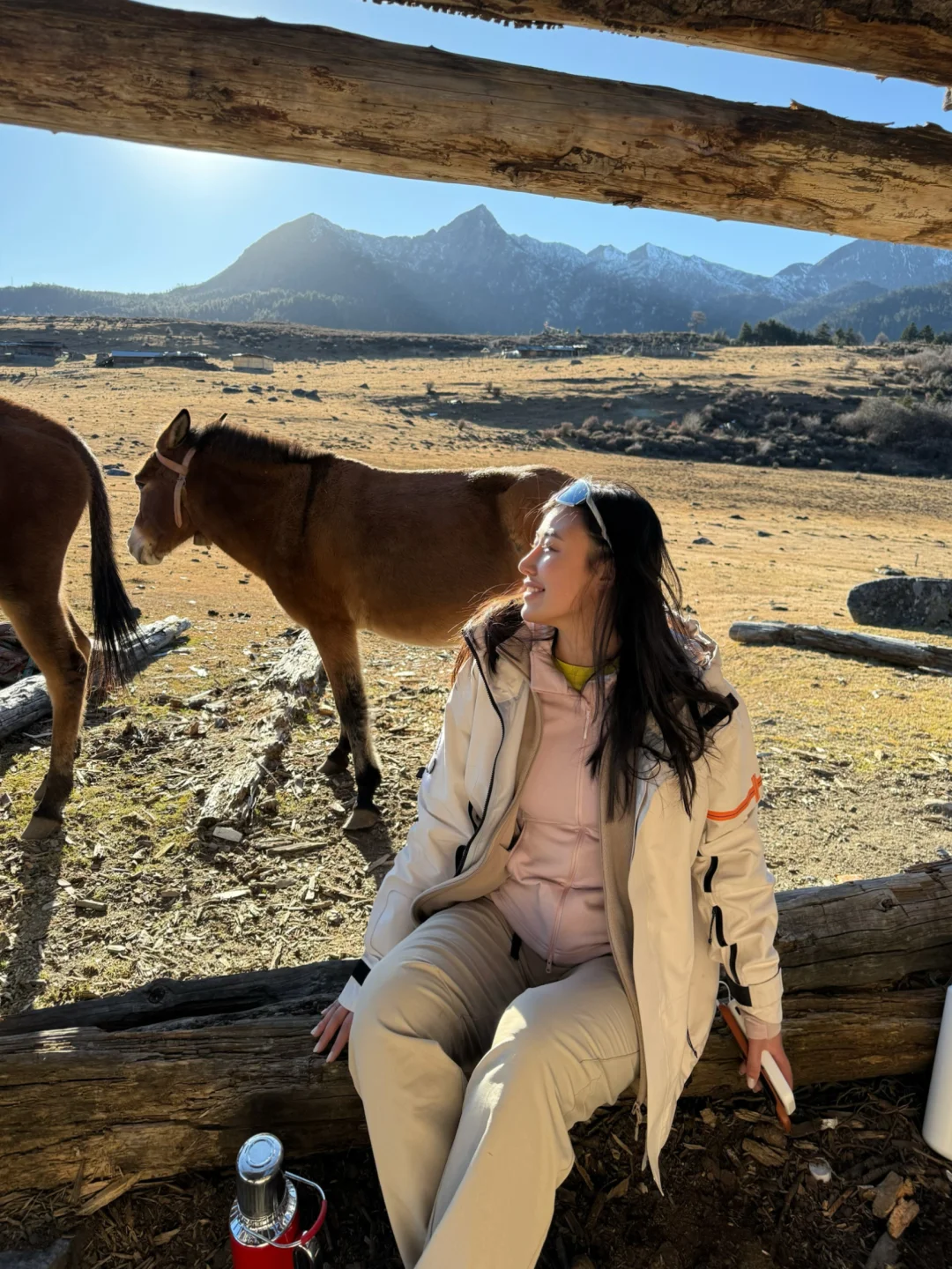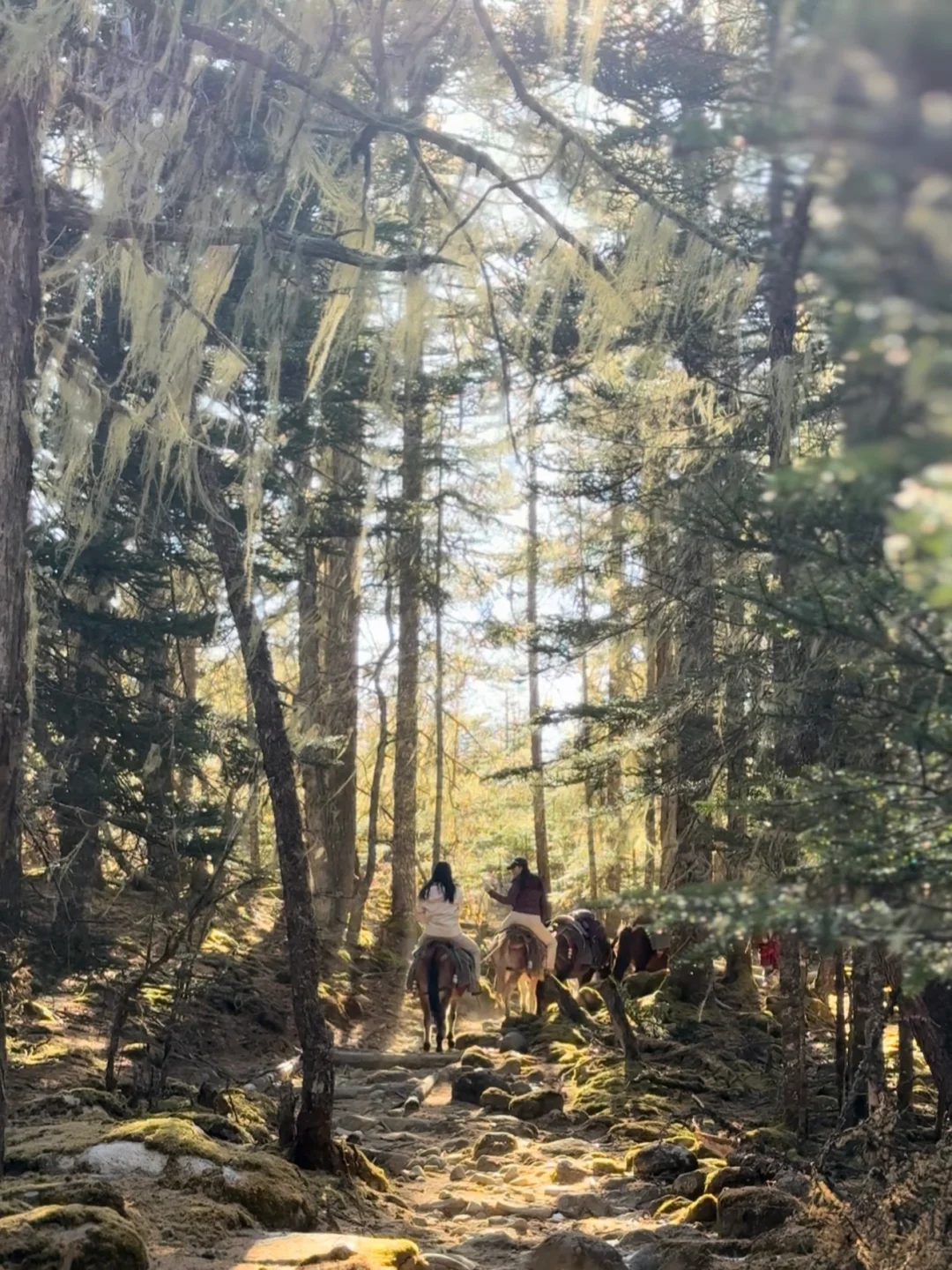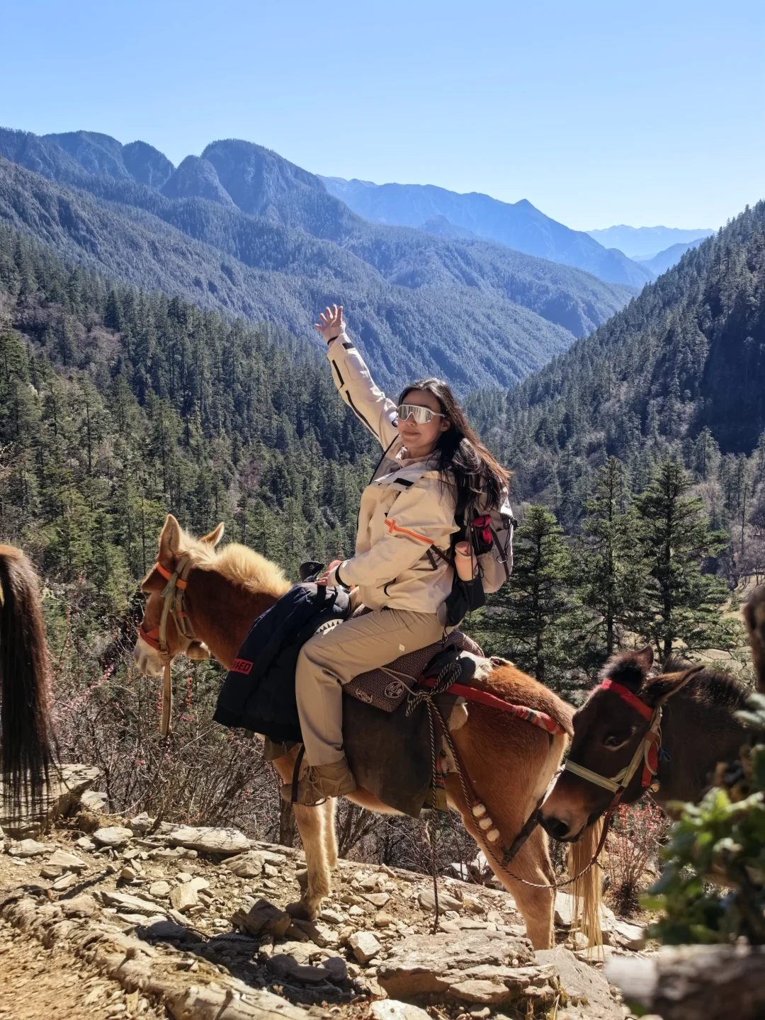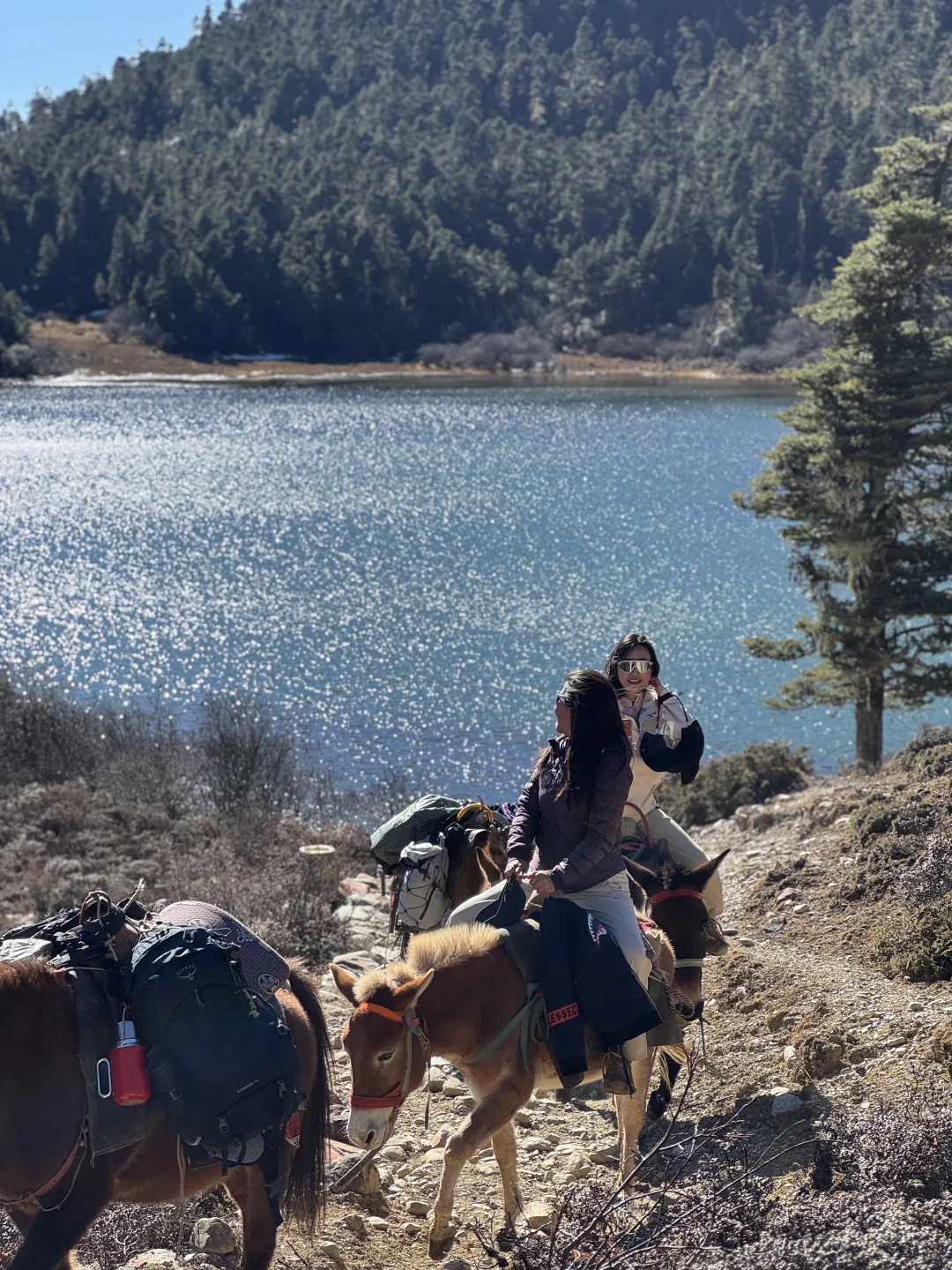 早上从泥汝村出发,我们请了两个当地向导,带着8匹骡马帮我们驮露营装备。累的时候还能骑一会。