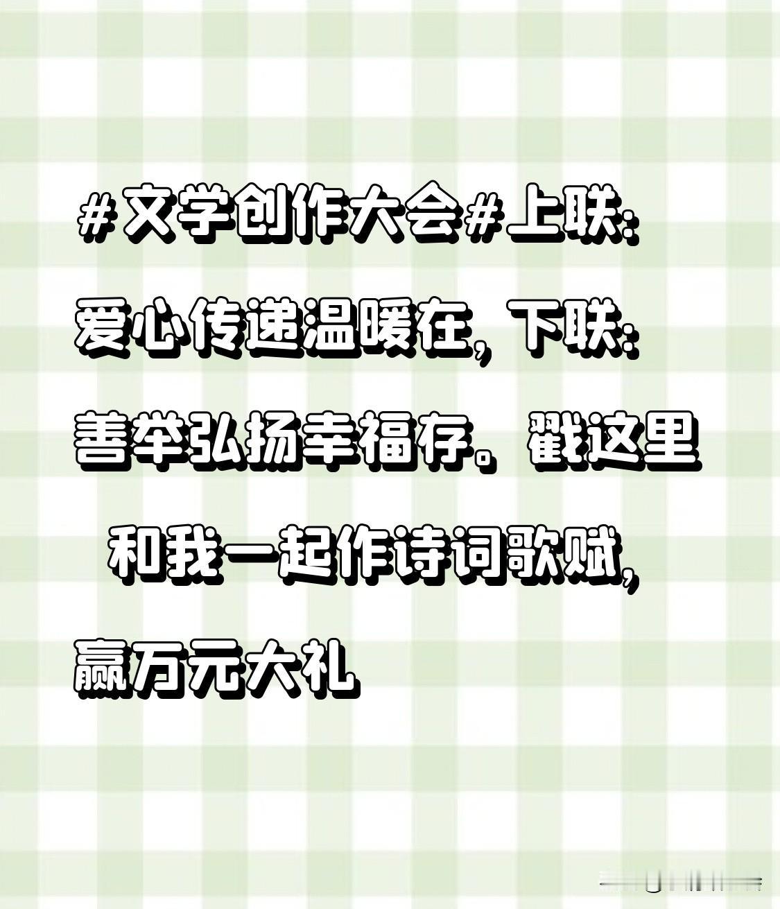文学创作大会 这上联“爱心传递温暖在”和下联“善举弘扬幸福存”对仗工整,意境也棒。“爱心传递”是多么美好的事儿,就像冬日里的暖阳,能让人与人之间的距离一下子拉近。当爱心在人群中流动,温暖就会常驻心间。而“善举弘扬”更是社会正能量的体现,每一个小小的善举,都可能点亮他人的生活,让幸福的种子生根发芽。 现在有这么个文学创作大会能让人一展身手,还能赢万元大礼,这谁能忍住不参加?赶紧戳进去,说不定下一个诗词歌赋大神就是咱!