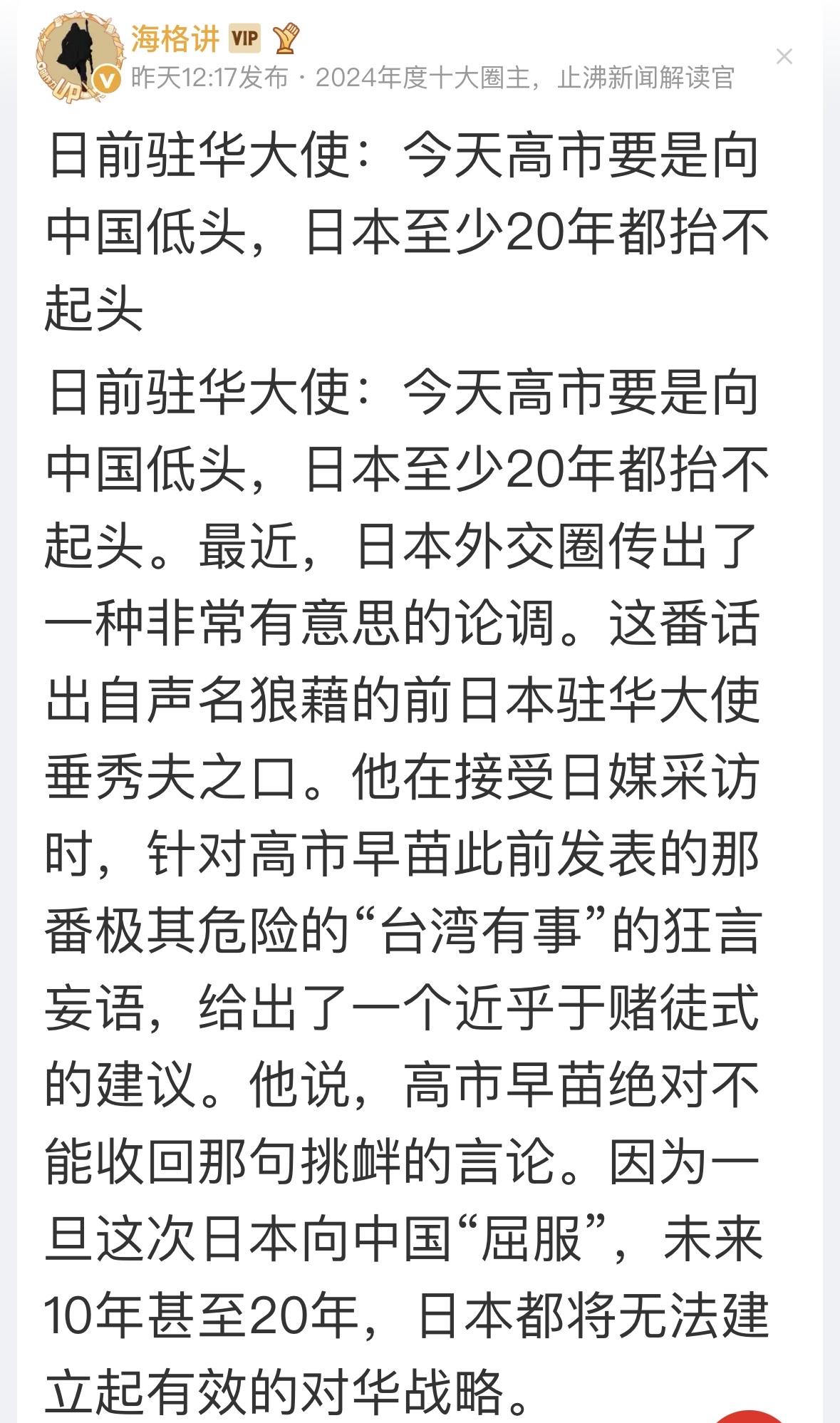 日本前驻华大使,高市早苗如果道歉,日本20年抬不起头,实事求是地说,如果不道歉,何止20年?让你永远抬不起头来!