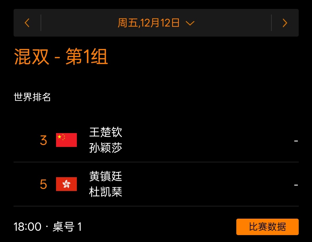 圆脸猫观察日记wtt香港总决赛2025 2025.12.12WTT香港总决赛孙颖莎今日双赛1️⃣混双循环赛VS黄镇廷/杜凯琹🇭🇰⏰18:00 一号台2️⃣女单1/4决赛孙颖莎🇨🇳vs长崎美柚🇯🇵⏰20:40 一号台一人一句孙颖莎健康完赛一切顺利!⛽