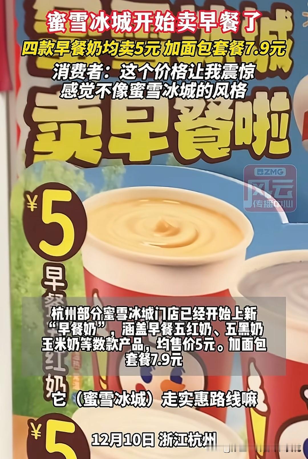 蜜雪冰城卖早餐之后,不少网友直呼太贵,早餐奶5块钱,再加个面包就要7.9元,也就是说吃个早餐要8块钱! 以蜜雪冰城以往的定价策略来看,价格都会很低,非常实惠,所以很多网友会觉得早餐奶加面包可能会卖到3块钱,这样很多早餐店就有压力了。不过7.9元这个价格,对大多数城里的打工人而言,是心理能接受的价位,毕竟普通的豆奶都卖到3元到5元一杯,一个肉包子都能卖到4元。 如果这样的价格到三线城市,恐怕路人会绕道,豆浆加油条,再来个鸡蛋都有可能三块钱,7.9元就已经大大超过普通人的早餐预算了。