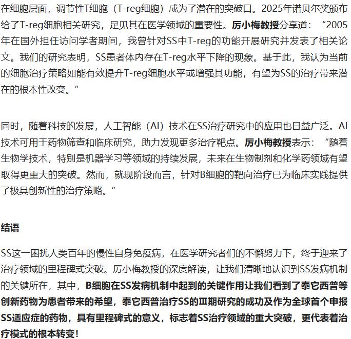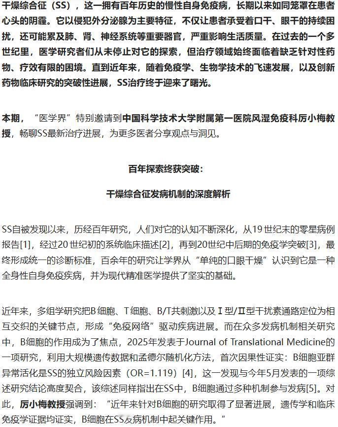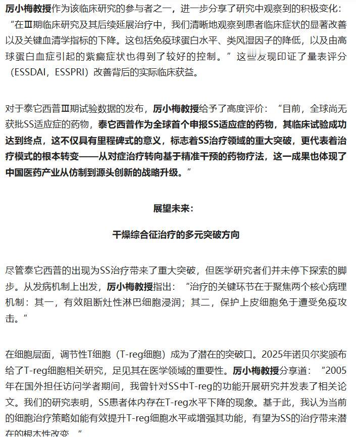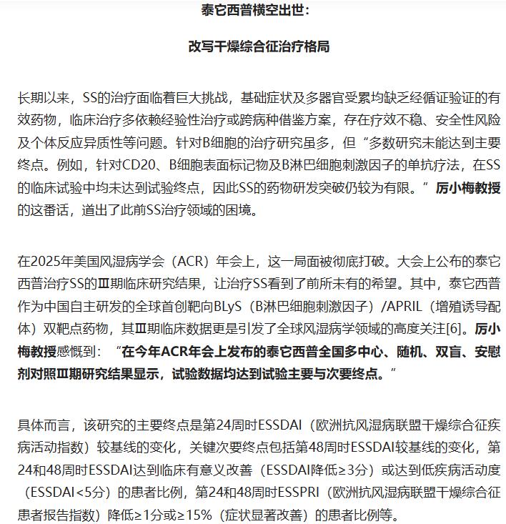 百年顽疾终迎破局!干燥综合征这一困扰人类的慢性自身免疫病,终于迈入精准治疗时代。中国原研全球首创双靶点药物泰它西普横空出世,靶向 BLyS/APRIL 通路精准出击,其 Ⅲ 期临床研究在 2025 年 ACR 年会惊艳亮相,全线达标主要与次要终点,不仅显著改善患者口干眼干等症状,更降低免疫球蛋白等关键血清学指标。 厉小梅教授盛赞这一里程碑突破,标志着治疗从对症转向精准干预,打破全球无获批药物的僵局。作为首个申报 SS 适应症的药物,它既彰显中国医药创新实力,更给千万患者带来久违的希望,开启干燥综合征治疗新纪元! 原文来自:医学界《中国原研泰它西普改写全球格局!厉小梅教授解读SS临床重大突破》