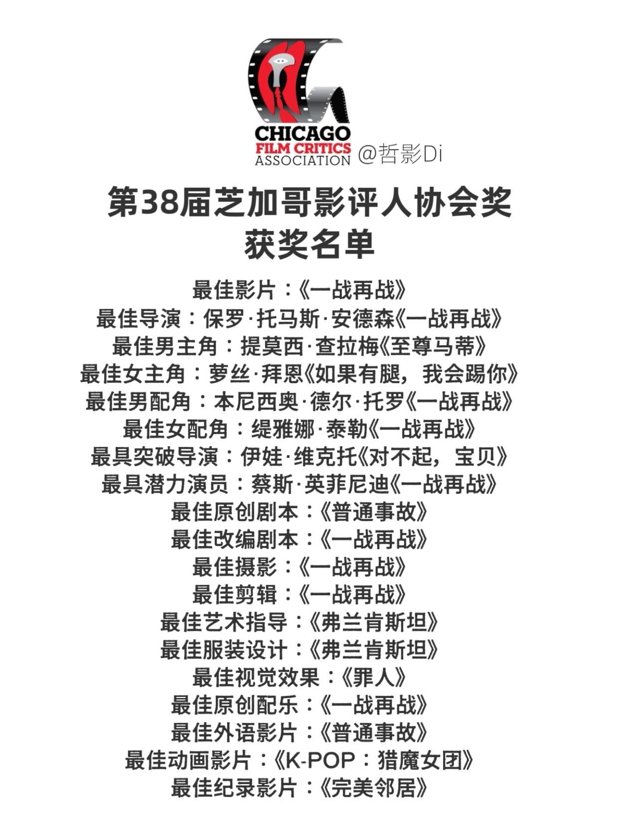 奥斯卡战线北美颁奖季重要前哨之一,第38届芝加哥影评人协会奖公布获奖名单,影片《一战再战》保持横扫势头,斩获此站包括最佳影片、最佳导演在内的9项大奖,成为最大赢家,萝丝·拜恩则凭借《如果有腿,我想踢你》连续获得影评人5站影后,领跑颁奖季。第38届芝加哥影评人协会奖获奖名单最佳影片:《一战再战》最佳导演:保罗·托马斯·安德森《一战再战》最佳男主角:提莫西·查拉梅《至尊马蒂》最佳女主角:萝丝·拜恩《如果有腿,我会踢你》最佳男配角:本尼西奥·德尔·托罗《一战再战》最佳女配角:缇雅娜·泰勒《一战再战》最具突破导演:伊娃·维克托《对不起,宝贝》最具潜力演员:蔡斯·英菲尼迪《一战再战》最佳原创剧本:《普通事故》最佳改编剧本:《一战再战》最佳摄影:《一战再战》最佳剪辑:《一战再战》最佳艺术指导:《弗兰肯斯坦》最佳服装设计:《弗兰肯斯坦》最佳视觉效果:《罪人》最佳原创配乐:《一战再战》最佳外语影片:《普通事故》最佳动画影片:《K-POP:猎魔女团》最佳纪录影片:《完美邻居》