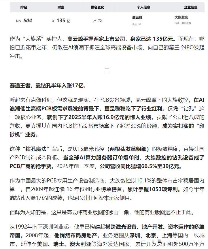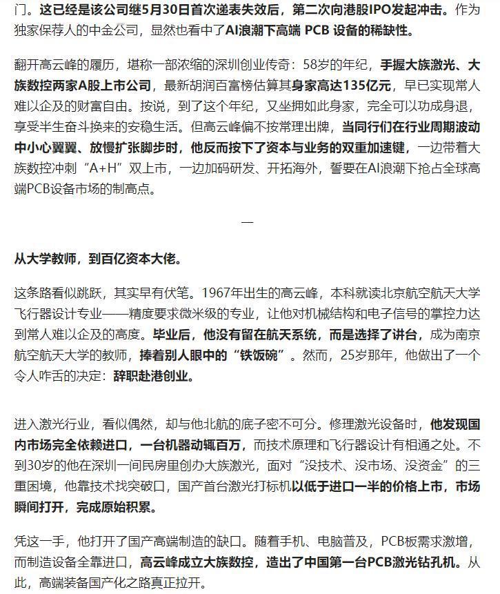 从大学教师到百亿大佬!高云峰 30 年跨界创业,携大族数控冲刺第三个 IPO 原文来自:投资家网《半年狂赚17亿,北航学霸要IPO》