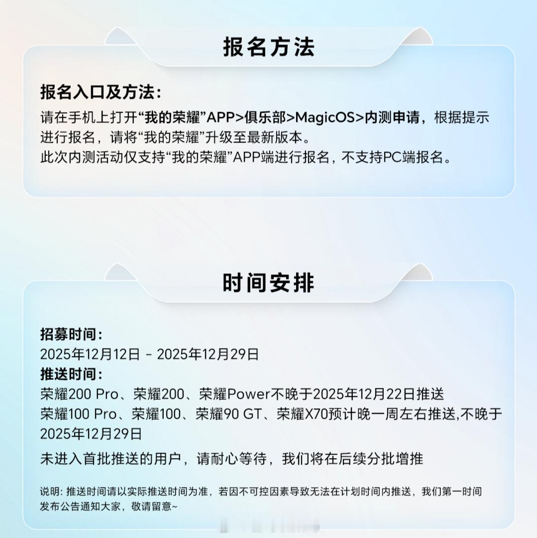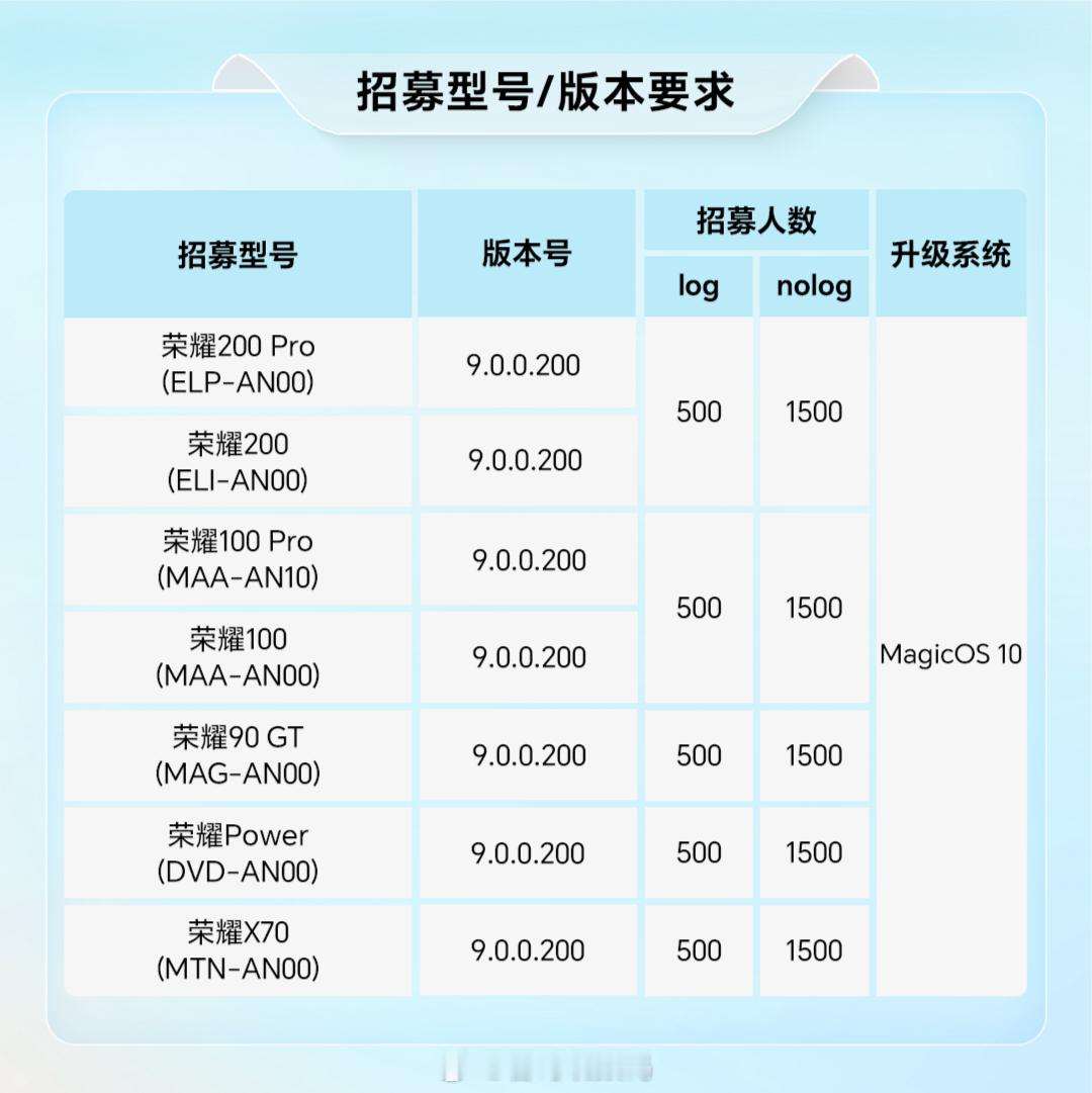 荣耀MagicOS10 Beta第六批内测招募开启,欢迎荣耀200系列、荣耀100系列、荣耀90 GT、荣耀Power、荣耀X70用户报名升级体验。荣耀MagicOSMagicOS月月新