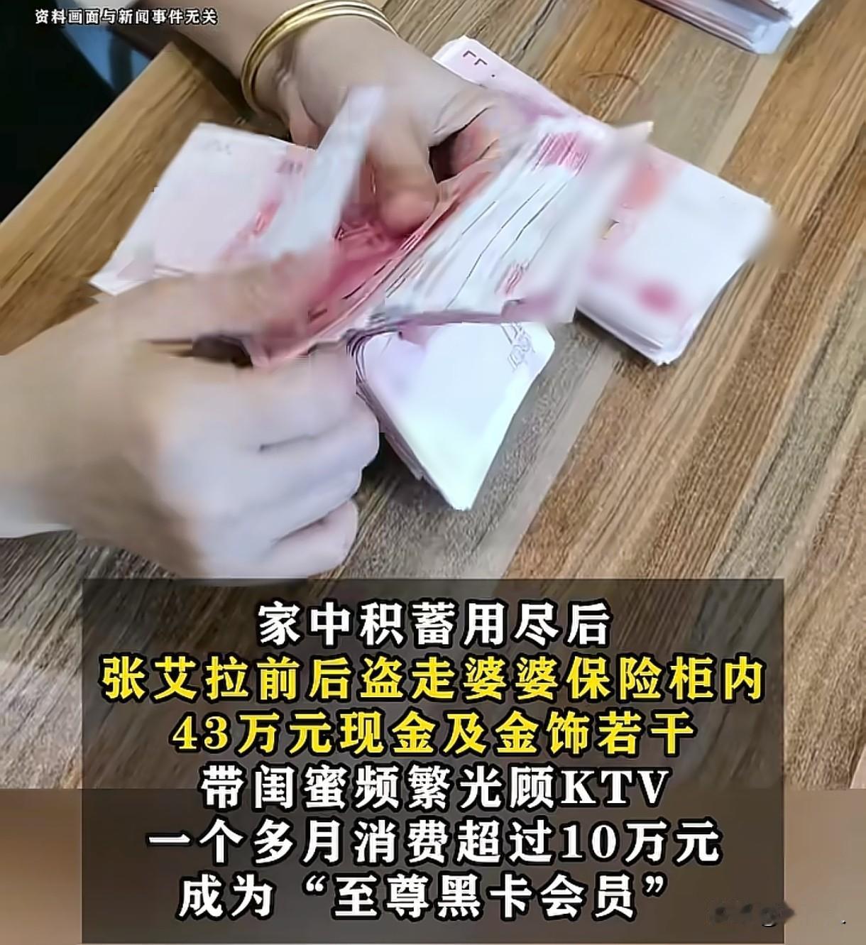 湖北宜昌,女子全职带娃,婆婆每月给她3000元,可她觉得不够用,让丈夫外出打工,婆婆周末帮自己带孩子,可并未如愿。女子一气之下,叫来开锁师傅,打开婆婆保险柜,分多次从里面把43万现金拿走,带闺蜜去KTV玩,一晚上消费上万元,40多天时间花光43万,婆婆发现后,报了警,但为了孙子又不得不出具谅解书,可女子还是因盗窃罪被提起公诉,法院判决令人意外。 2022年,00后女子小张和男子刘某登记结婚。谭女士作为新郎的母亲,欢天喜地的为儿子操办了婚事。 她原本想着儿子儿媳结了婚,她也能松口气,过上含饴弄孙的晚年时光了。 婚后不久,小张生下儿子,全职在家带娃,谭女士出于对儿子一家的关爱,每月拿3000元生活费给儿媳。 她想着,儿子儿媳手上还有结婚时的彩礼,加上自己的帮衬,他们一家三口的日子应该是能过的安稳的。 可没想到,儿子儿媳却闹起了离婚,儿媳认为儿子天天呆家里,也不出去工作挣钱,三年下来,两人的彩礼基本都花光了,两人的经济压力很大。 有时候她希望婆婆能在周末帮自己带一下孩子,让自己喘口气,可婆婆总是借口忙,也不过来。 当时孙子还小,谭女士不想儿子儿媳这个家散了,找了亲友多次劝和。 后经双方家人劝解,小张答应跟刘某好好过日子,不再提离婚的事情。 谭女士见状,也放下心来,没有多想。 2025年5月的一天,一个朋友告诉谭女士,看到她儿媳经常出入KTV,还是KTV的黑卡会员,要办这种卡,需要消费金额超过10万元以上。 这个消息让谭女士心中升起一股不祥的预感,靠着儿子儿媳自己的经济能力,是不可能拿出这么多钱去消费的。 她打开自己的保险柜,结果却发现自己放在保险柜里的43万现金和一些金饰不翼而飞了。 谭女士心急如焚,立刻报了警。 随着警方的调查,真相逐渐浮出水面。 原来,保险柜里的现金和金饰都是儿媳小张拿走的。 虽然之前经人劝和,小张表面上答应不再闹离婚,但她内心却越来越不平衡,丈夫躺平啃老不作为,婆婆不理解,生活的压力和心里的压力,让她很不开心。 她发现婆婆谭女士有在家中存放现金的习惯,于是心生贪念,趁着婆婆不在家,她谎称家里保险柜的钥匙丢了,叫来开锁师傅上门,打开了保险柜。 当天,她从保险柜中拿走了25300元;仅仅两天后,她又再次伸手,拿走了7万多元。 拿到钱后的小张,开启了她的消费狂欢,当天晚上,她就带着闺蜜来到KTV,唱歌喝酒,一晚上的消费就超万元。 此后,她更是频繁出入KTV,享受着纸醉金迷的生活。没钱了,就去婆婆的保险柜里面拿。 不仅如此,她还带着孩子去了外地旅游,并在外租房居住,短短40多天的时间,她就把40多万巨款挥霍一空。 谭女士愤怒难平,自己已经给儿子儿媳拿了生活费,如果儿子儿媳实在有难处,完全可以跟她开口说,可儿媳却把她的钱全部偷走挥霍,这让她实在难以接受。 可谭女士的儿子和亲家却多次恳求她,不看在大人的面上,也得顾念小孙子,小张要是进去了,那对孩子以后的影响就大了。 最终,谭女士选择了谅解儿媳,给她出具了谅解书。 对于家庭成员之间的盗窃行为会如何处罚呢? 《刑法》第264条规定:盗窃公私财物,数额特别巨大或者有其他特别严重情节的,处十年以上有期徒刑或者无期徒刑,并处罚金或者没收财产。 小张盗窃谭女士43万现金及金饰的行为,属于盗窃公私财物数额特别巨大的情形,其行为构成盗窃罪,本应处十年以上有期徒刑或者无期徒刑,并处罚金或者没收财产。 但是谭女士顾念年幼的孙子,最终选择谅解小张,给小张出具了谅解书。 《最高人民法院、最高人民检察院关于办理盗窃刑事案件适用法律若干问题的解释》第8条规定:偷拿家庭成员或者近亲属的财物,获得谅解的,一般可不认为是犯罪;追究刑事责任的,应当酌情从宽。 偷拿家庭成员或者近亲属财物后取得谅解,通常可不认为是犯罪,如财物价值较小、情节较轻,且亲属明确表示宽恕的,司法实践中多倾向于不予刑事追究。‌ 若行为情节严重,如多次盗窃、数额较大或亲属强烈要求追究责任,也可能被依法追究刑事责任,但是处罚会酌情从宽。‌ 最终,法院综合考虑各种因素,判决小张犯盗窃罪,判处其有期徒刑3年,缓刑4年,并处罚金5000元,同时责令她赔偿全部被盗款项。 有人说婆婆每月补贴3000元还不知足,多少人没有这个待遇。 如果偷钱用来贴补家用,好好过日子,还值得原谅,但是用来挥霍,让钱花得毫无意义,应该严惩。 也有人说这家的儿子也毫无担当,夫妻两个都在家里不工作,靠着长辈接济,这本身就是一种悲剧。 在婚姻生活中,夫妻双方都应当承担起各自的责任,共同为家庭的幸福努力。 长辈也要避免过度干涉,应当让年轻人自己承担起照顾家庭的责任,只有自己知道挣钱难,才会好好珍惜所拥有的一切。 大家觉得,小张值得被原谅吗?