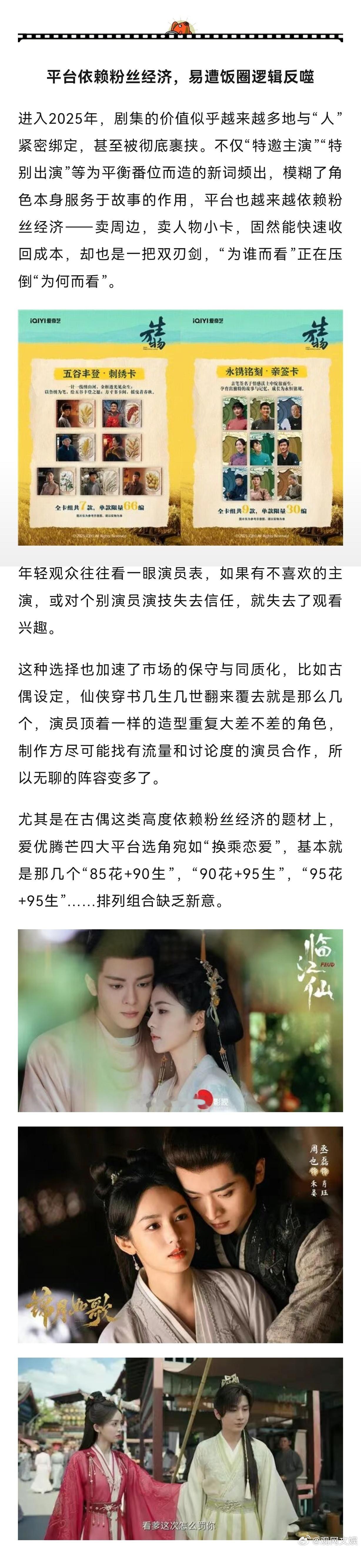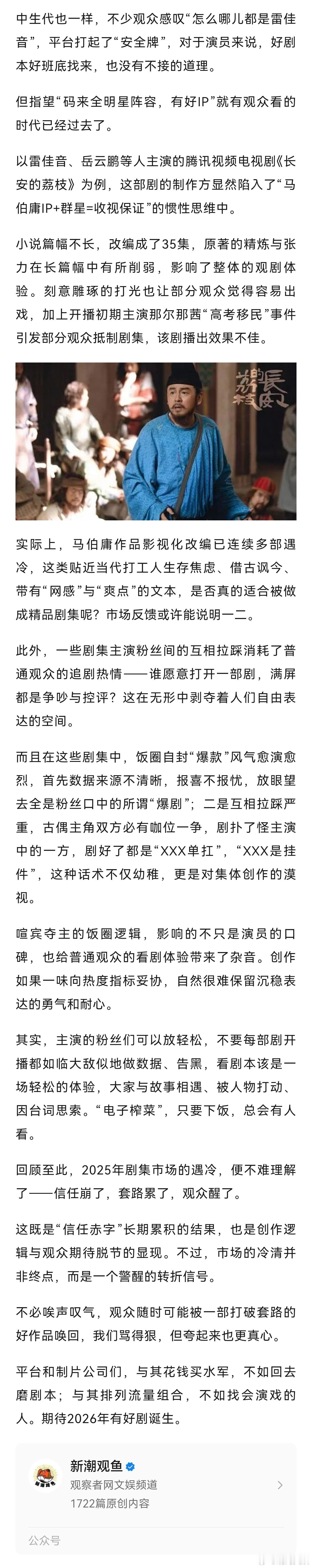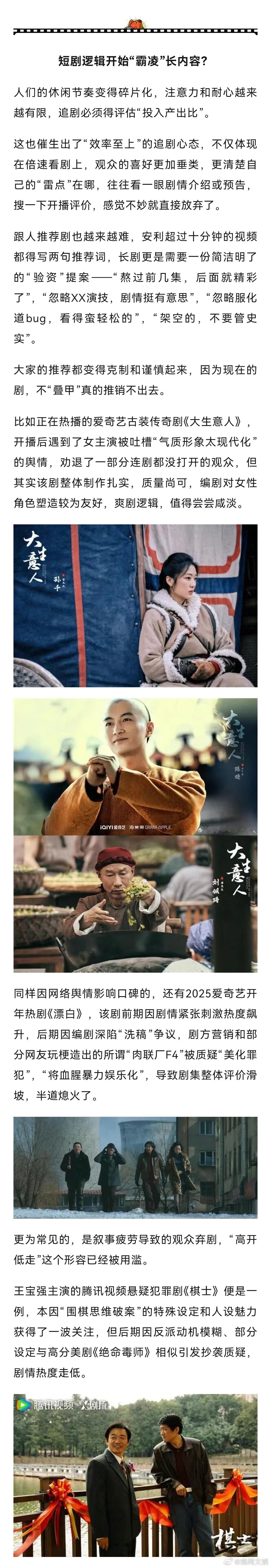 【国产剧弃剧率高是观众的问题吗】影视寒冬喊了几年,今年可谓是目前最“冷”的一年,一年下来,想不起来有哪几部国产剧能坚持从头到尾看完。观众的集体退货让2025剧集遇冷去年,市场尚有《我的阿勒泰》《山花烂漫时》《庆余年第二季》《墨雨云间》《玫瑰的故事》《繁花》《小巷人家》《与凤行》《我是刑警》《永夜星河》《九重紫》等一批口碑好或网络热度突出的作品出现,时不时增强市场信心,满足不同喜好观众的需求。到了今年,数据显示,截至目前,各平台头部剧集有《生万物》《以法之名》《藏海传》《国色芳华》《漂白》《许我耀眼》,其中一半都是仅粉丝可见。一堆大投资或知名制片公司出品的预制“剧王”未能挑起大梁,一堆以往最容易出现男女主“咖位飞升”的偶像IP剧不温不火地播完。有人调侃,2025年,“国产剧的弃剧率比女装退货率还高”,各平台排得满满当当的上剧档期,如同大促期间的网红店铺——看似热火朝天,发货量大,退货量也大。这背后,都是消费者期待与产品品质的落差:说白了,内容趋同、货不对板。女装压价压成本,成品材质颜色与样衣不同、预售期长等问题,推高了女装退货率,但消费者还有运费险“兜底”。对于难看的剧集呢?每年上百元的视频平台会员费充了,新上架的内容里没有感兴趣的可看,长此以往,失望累积,被“退回”的就是观众对平台的耐心与信任,新剧推到眼前也不愿意点开。今年的剧集遇冷,更像是一场失望累积了好几年后,观众的集体“退货”。